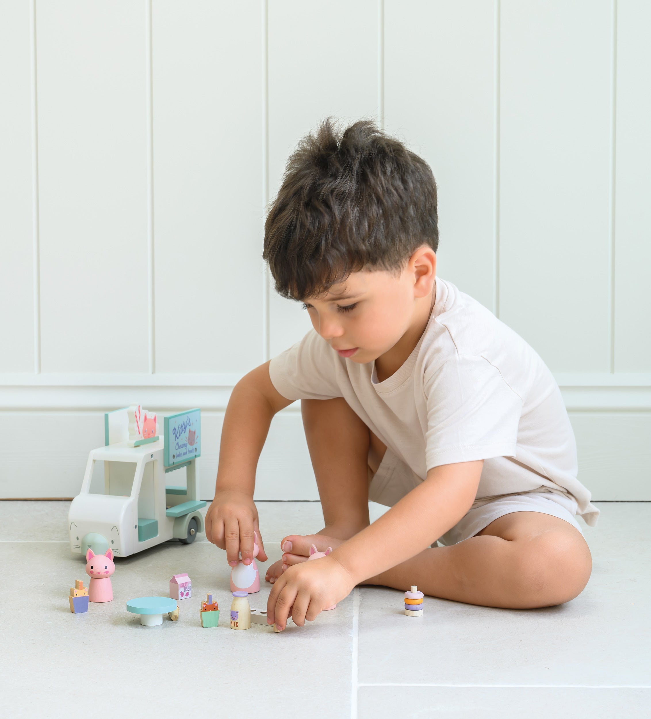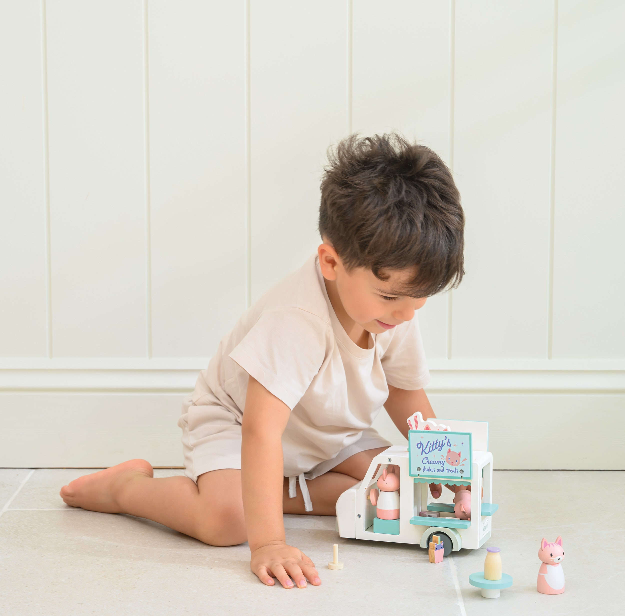 Meet Kitty and her hard working family! They are running about town serving up delicious milkshakes, doughnuts, and ice creams through the hatches on all 3 sides of their white 3 wheeler van. A fold up backdrop completes the scene and adds to more story telling opportunities. Good for imaginative play. Good for storytelling.