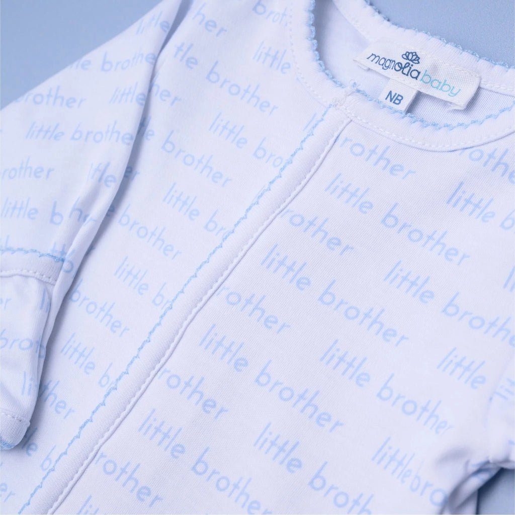 Celebrate the special bond between siblings with our Little Brother Print Footie! Crafted from luxurious Pima Cotton, this footie offers unparalleled softness and comfort for your little one. The design features an all-over "little brother" print in a gentle light blue, highlighting his special role.