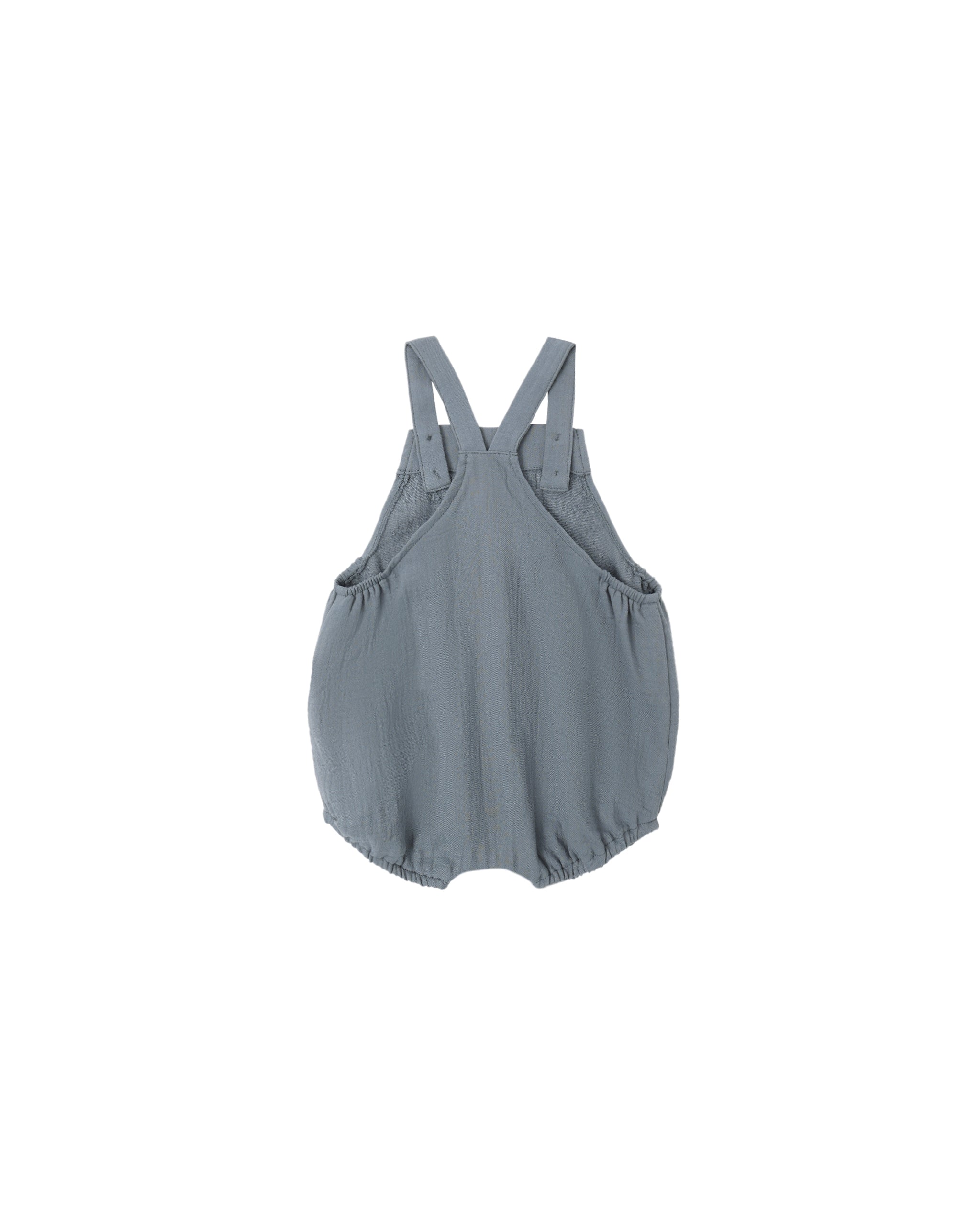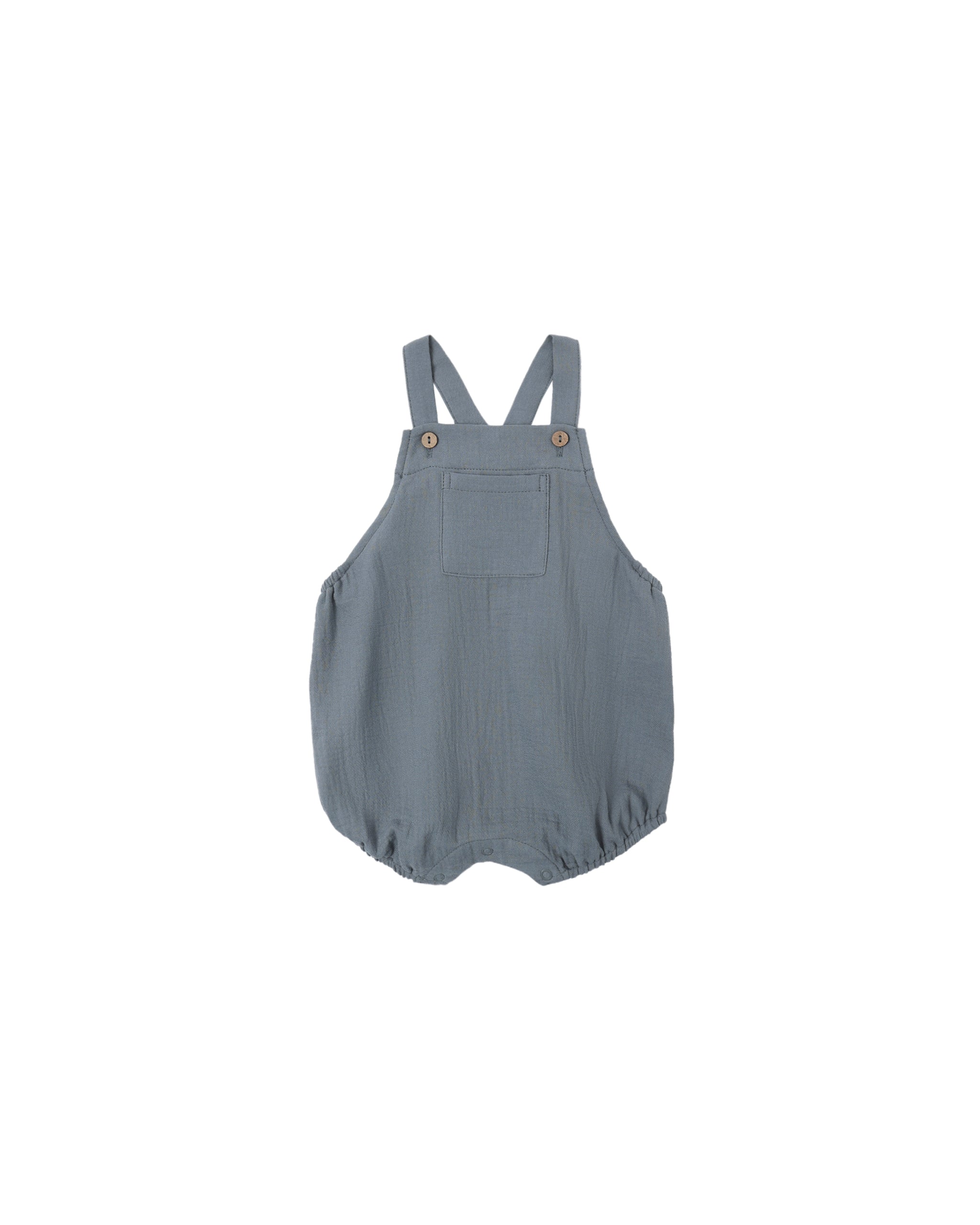 Woven overall romper featuring buttoned straps, an open bib pocket, and elastic leg openings.