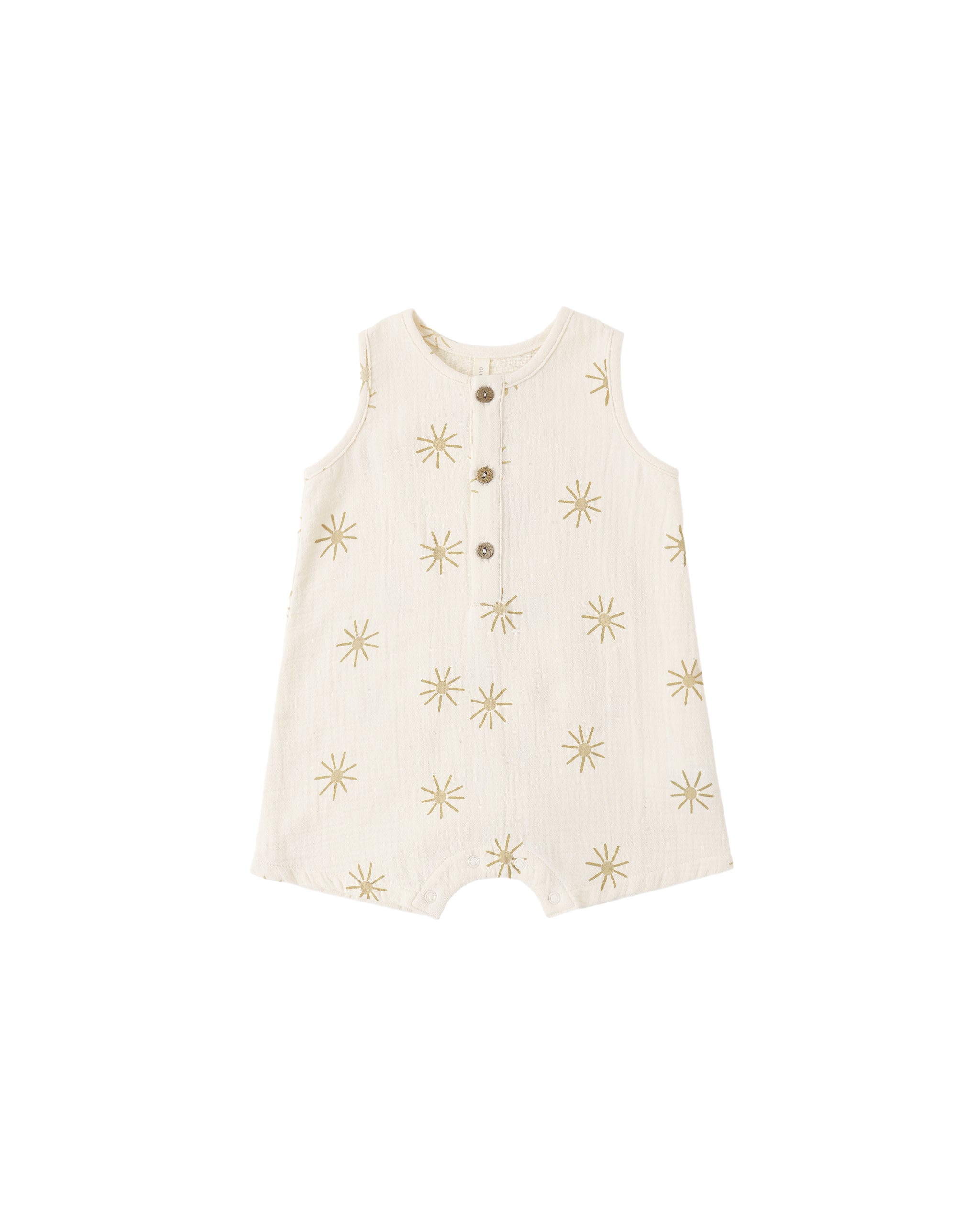 This slim cut sleeveless romper is an everyday essential for the warm days ahead. Includes front buttons and bottom snaps for easy changes.