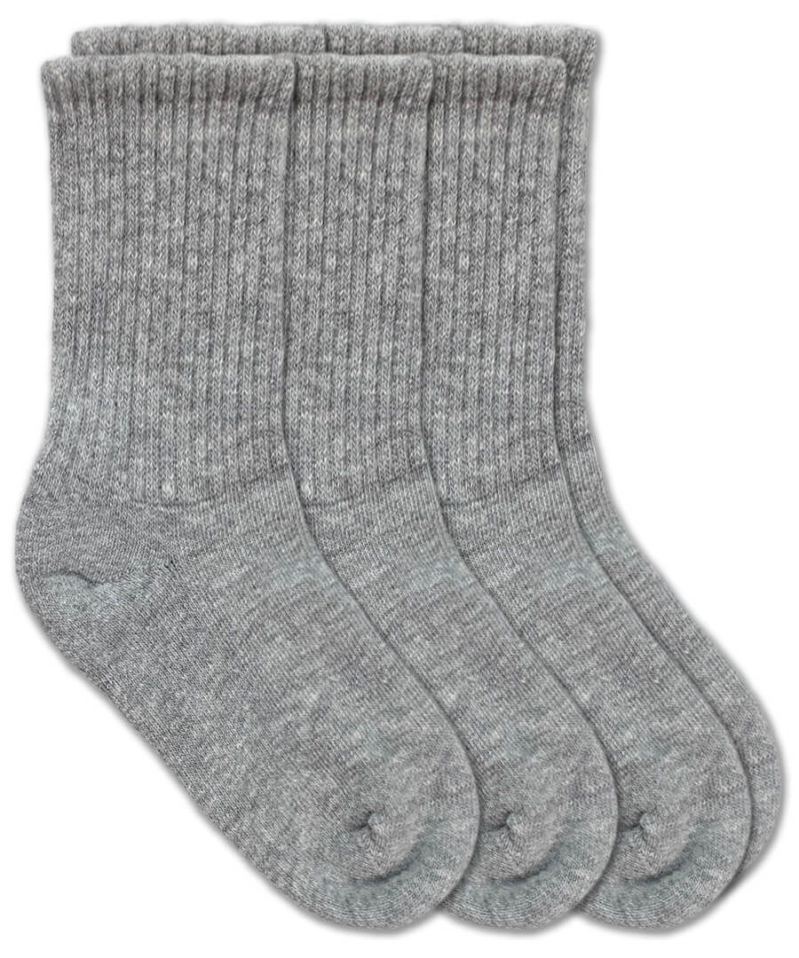 Grey heather sport socks that are sensory friendly for active girls and boys! Smooth toe seam provides less bulk and irritation for sensitive feet. Ribbed top keep socks on and half cushion foot provides extra impact protection. Durable cotton rich blend with optimal stretch for a snug and comfortable fit. Perfect for school, sports, uniforms, play, and everyday.