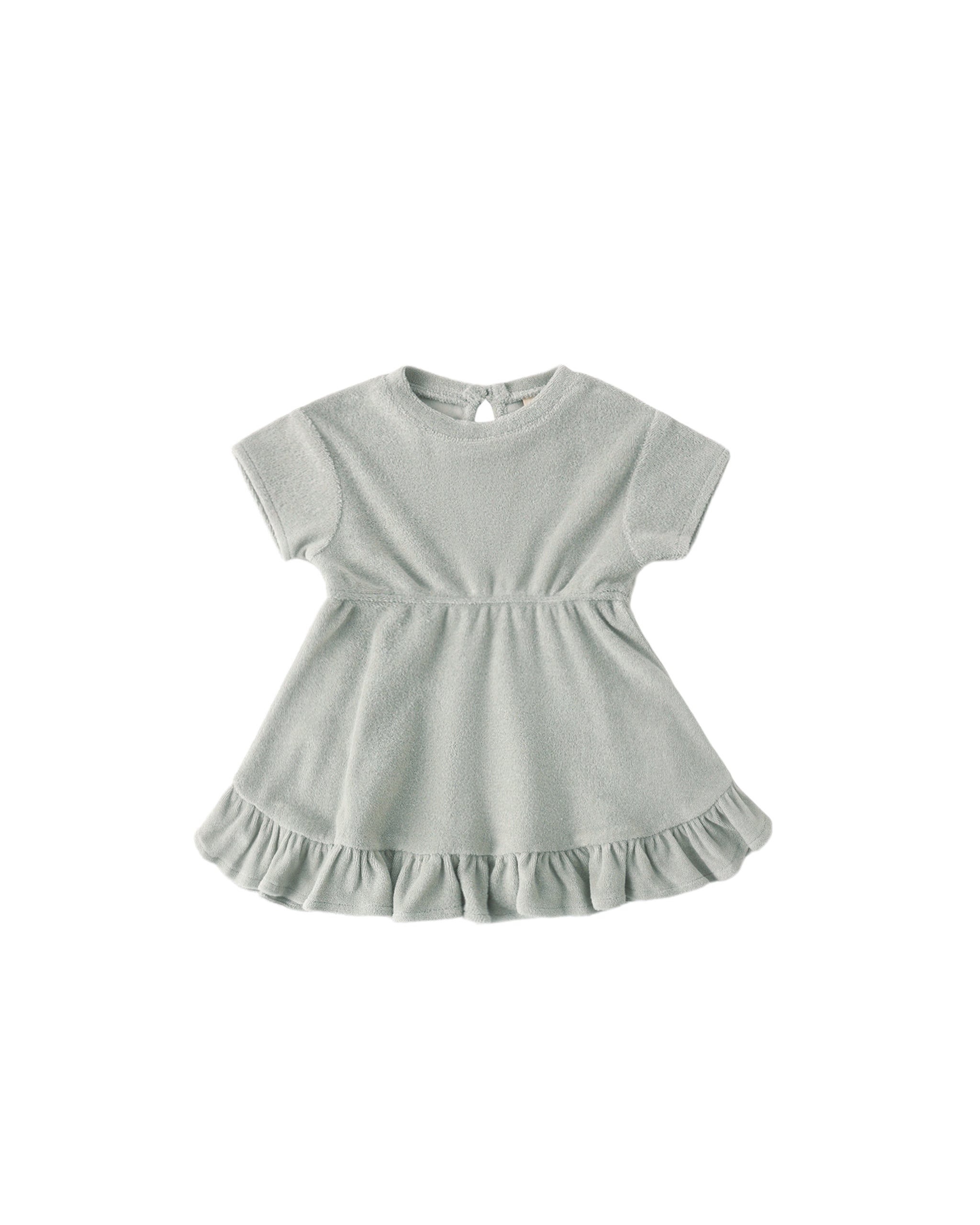 This sweet dress made of our terry cloth fabric features ruffle trim, an elasticized waist, and a button keyhole closure for the perfect fit. Coordinating bloomers included with all sizes.
