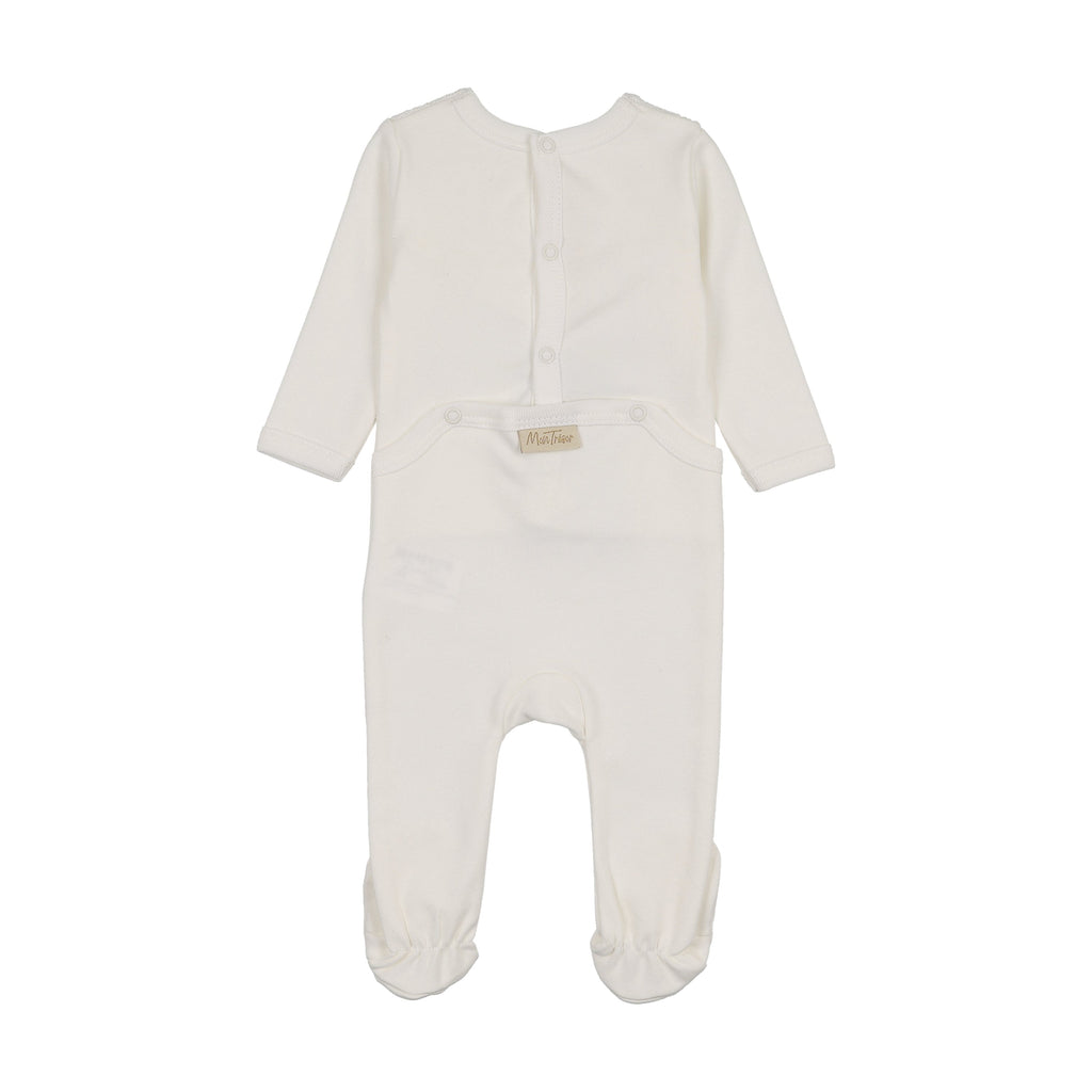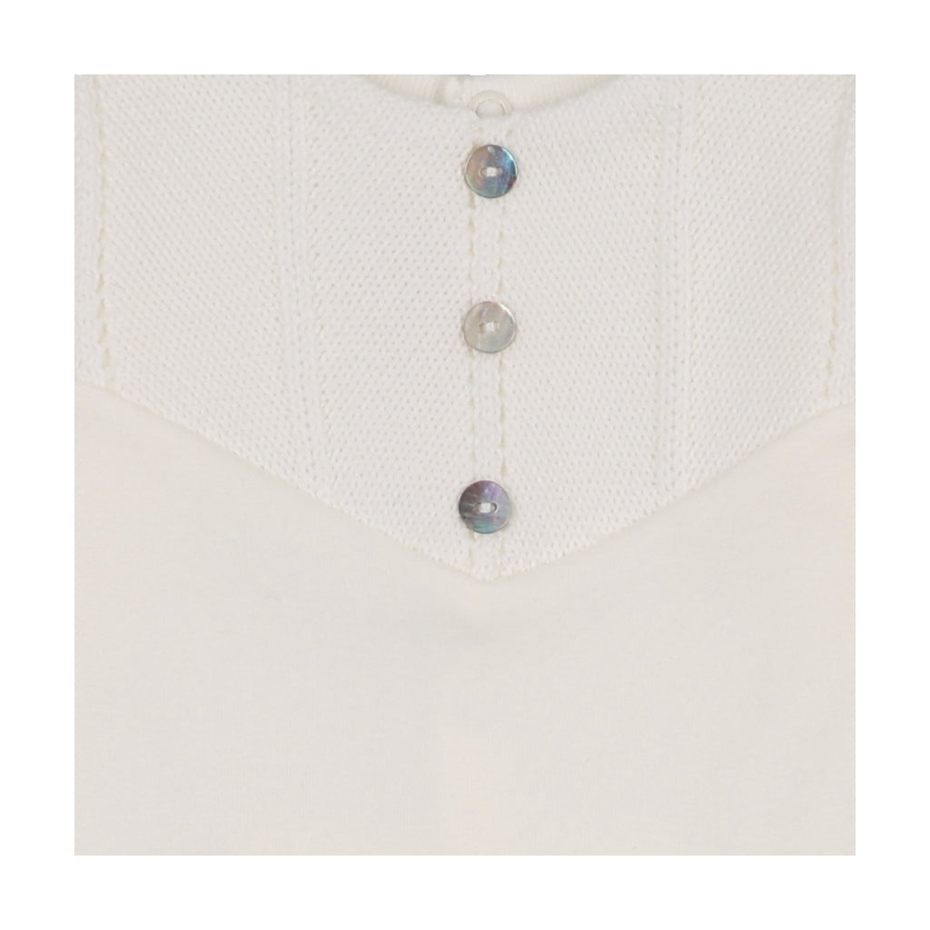 Soft, snuggable cotton with a ribbed knit overlay in a sleek V-shape, creating a stylish bib effect. The Henley-style design with three buttons down the neck adds a touch of classic charm. Paired with a matching knit hat and a blanket with knit detailing on the edge.