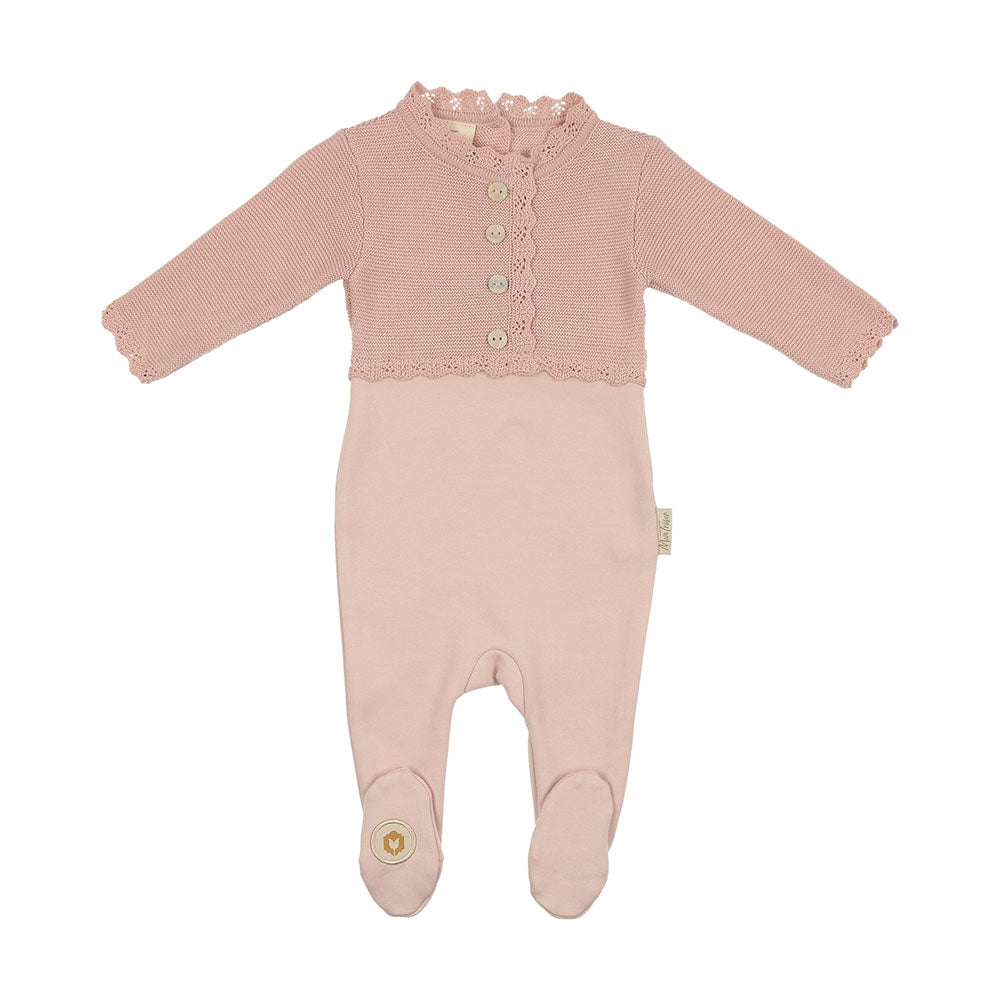 Want the look of an ensemble without the getting-dressed stress? We’ve created this one piece with an utterly charming layered look. Includes a cotton footie and purl knit mock-cardigan with scalloped trim.