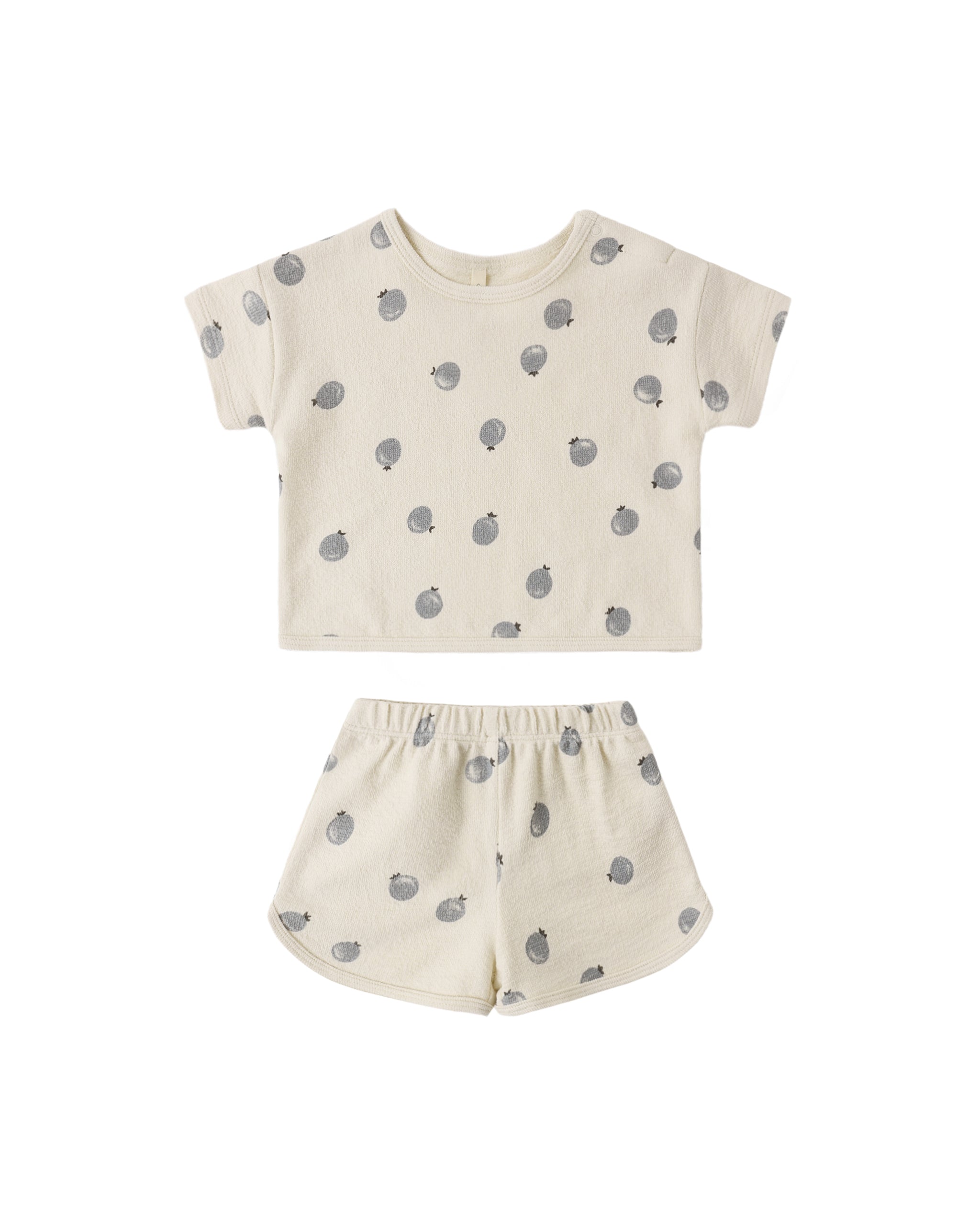 This easy breezy set made from our fun spongey knit is perfect for warm weather days. - Featuring our ‘blueberries’ print on our ‘natural’ hue. This sweet print is perfect for sunny days. - Care: Machine wash cold. Tumble dry low. - Made of 100% organic cotton. 100%organic cotton