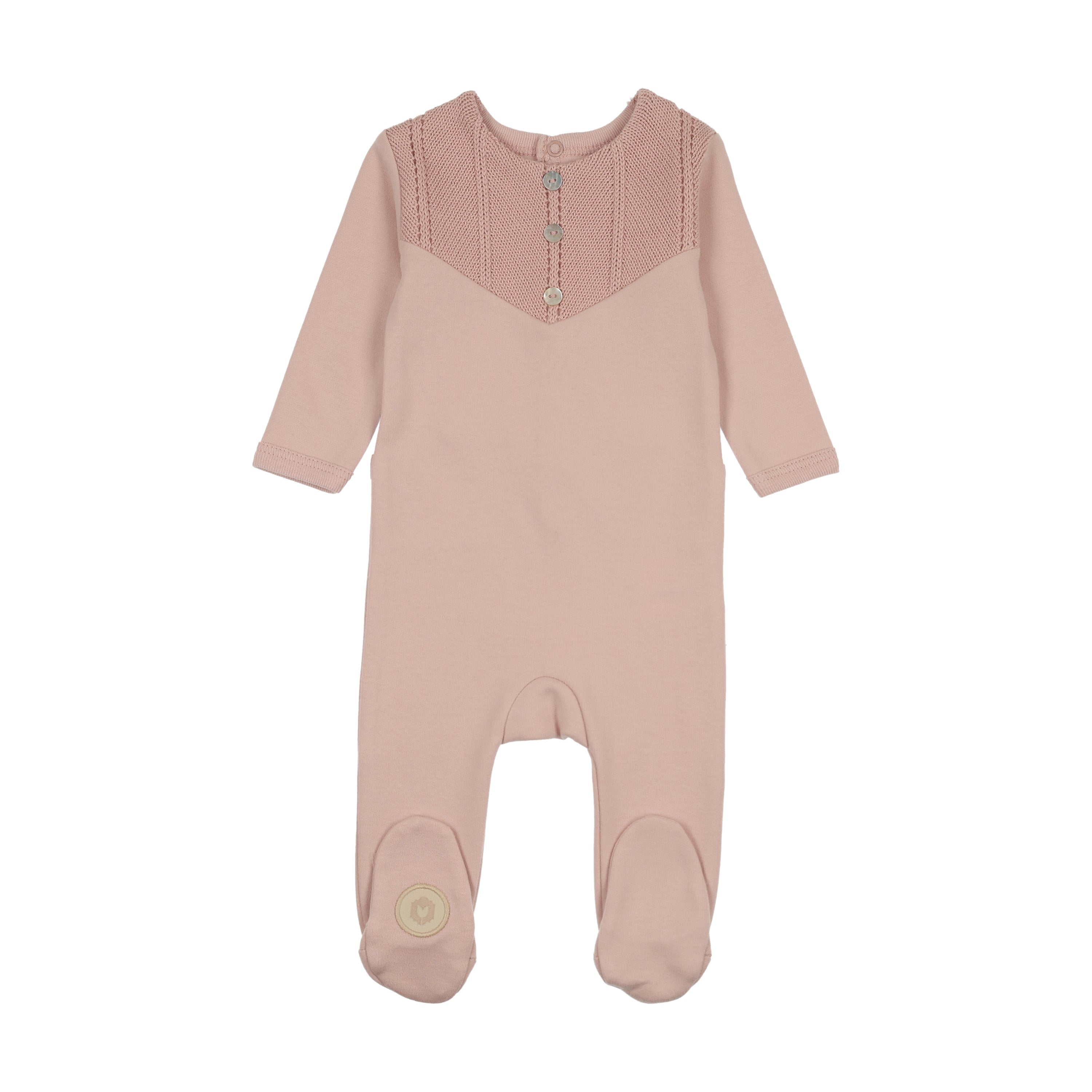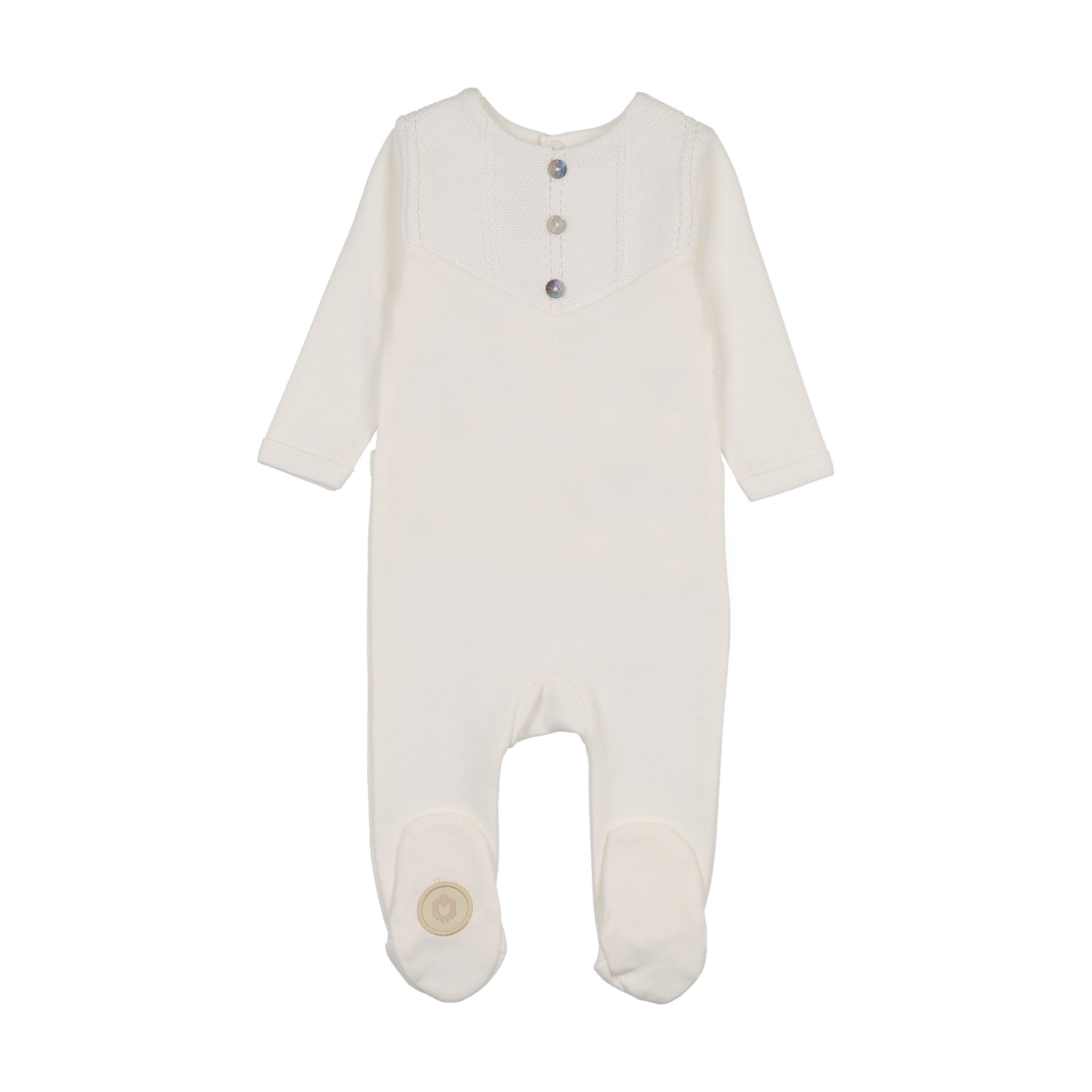 Soft, snuggable cotton with a ribbed knit overlay in a sleek V-shape, creating a stylish bib effect. The Henley-style design with three buttons down the neck adds a touch of classic charm. Paired with a matching knit hat and a blanket with knit detailing on the edge.
