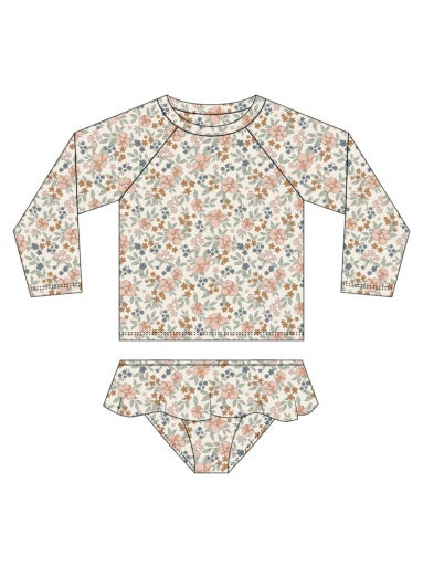 This two-piece rashguard set will have your little one protected from the sun in style. Featuring a long sleeve rashguard top and coordinating ruffle skirted bikini bottom.