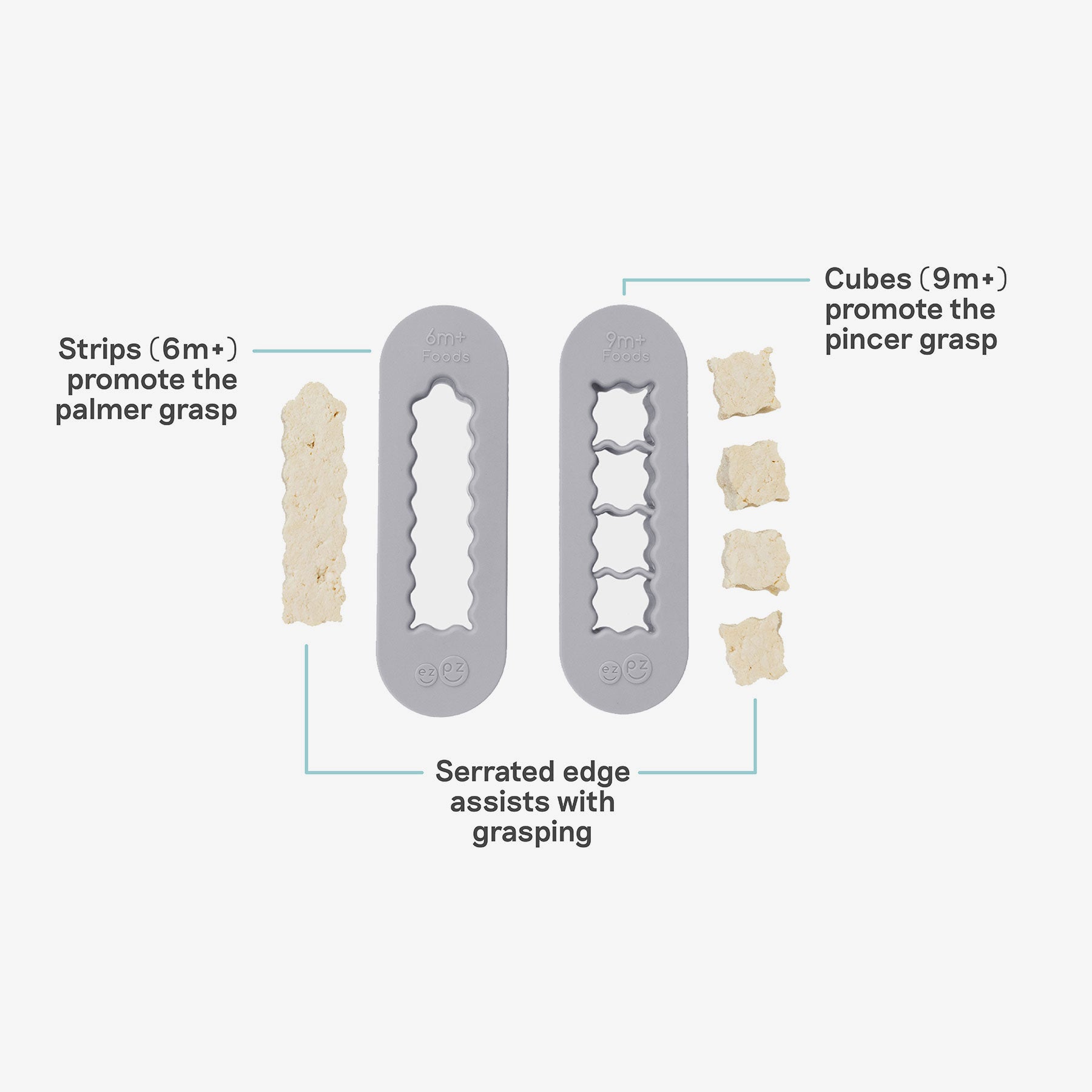 The ezpz food cutters make baby-led weaning food prep ezpz! Start with the food cutter for food strips (6m+) to promote the palmar grasp. At 9m+ layer in the cubed food cutter to promote the pincer grasp.