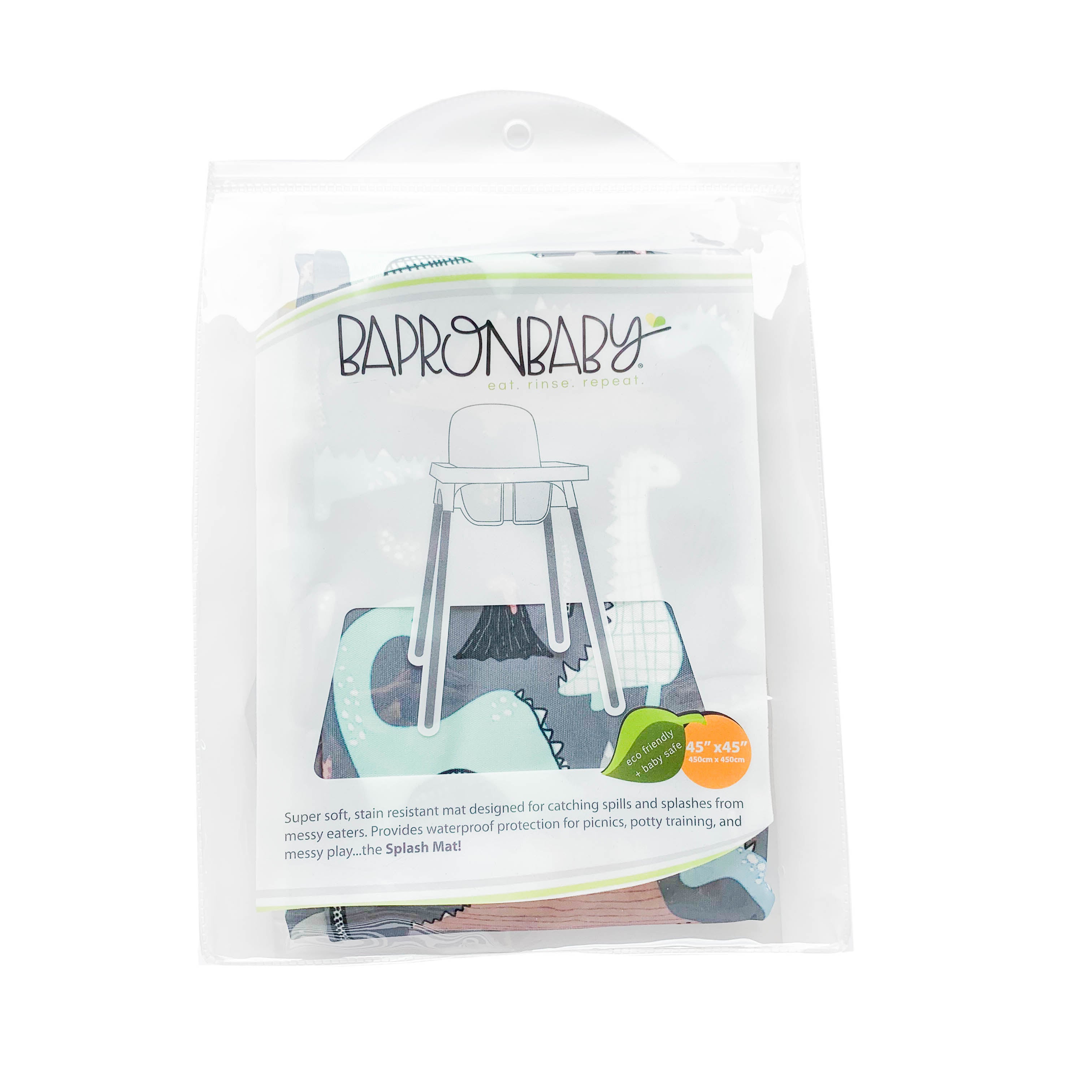 BapronBaby's unique waterproof fabric is stain resistant, and machine washable.  Three cheers for no more scraping dried juice spots off the tile and scrubbing oatmeal out of the carpet! This mat weighs less than 8oz. and folds up to the size of a small book for easy transport.