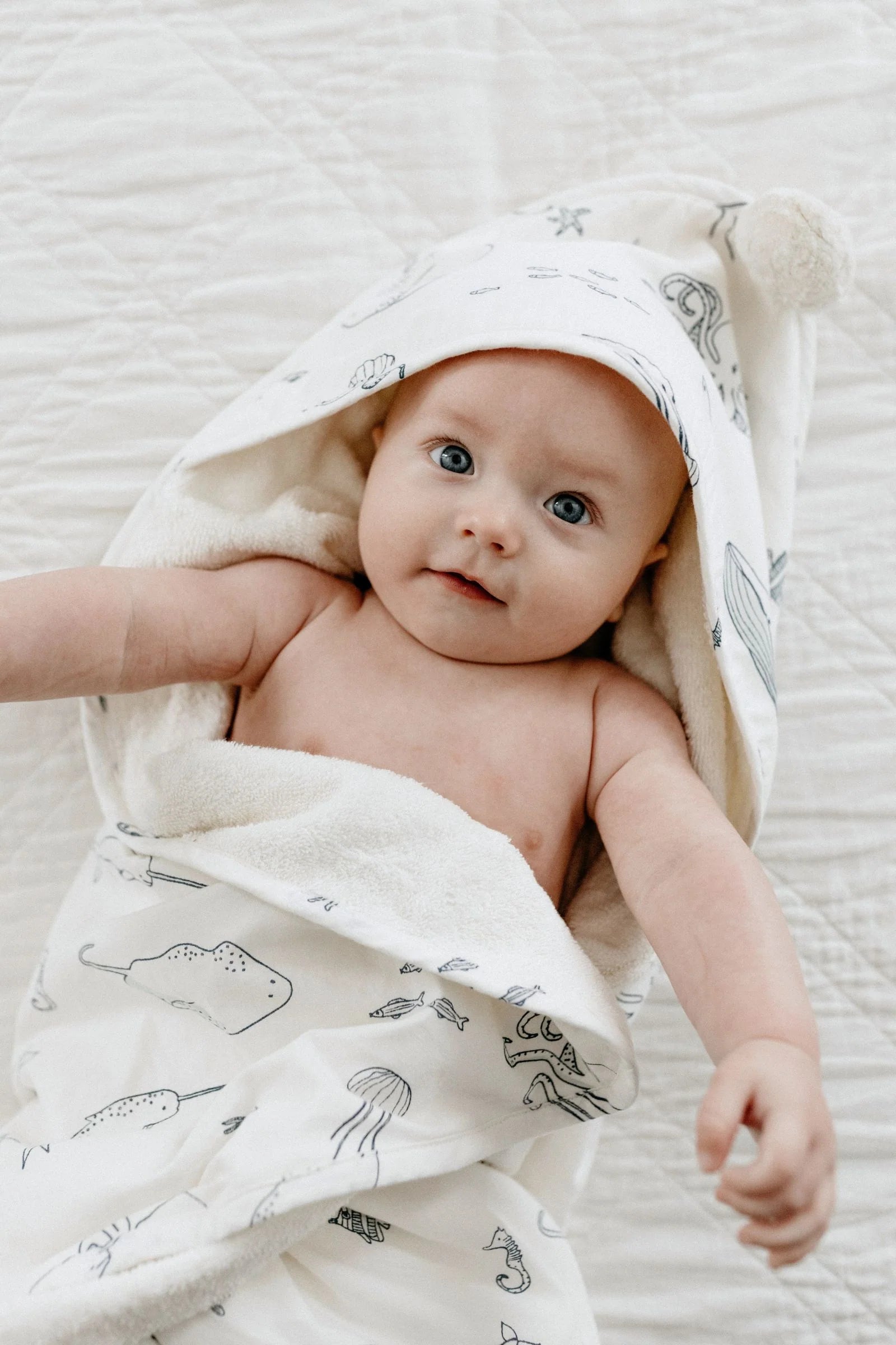 The Hooded Towel from Pehr is a cozy essential for bath time and beyond, thoughtfully curated by BellaBoo to grow with your little one. Designed to wrap baby from head to toe, it features a soft, absorbent French terry interior for quick drying and a gently brushed cotton exterior for extra comfort. A cozy hood and signature pom pom detail make it perfect for post bath cuddles, pool days, and beach adventures.