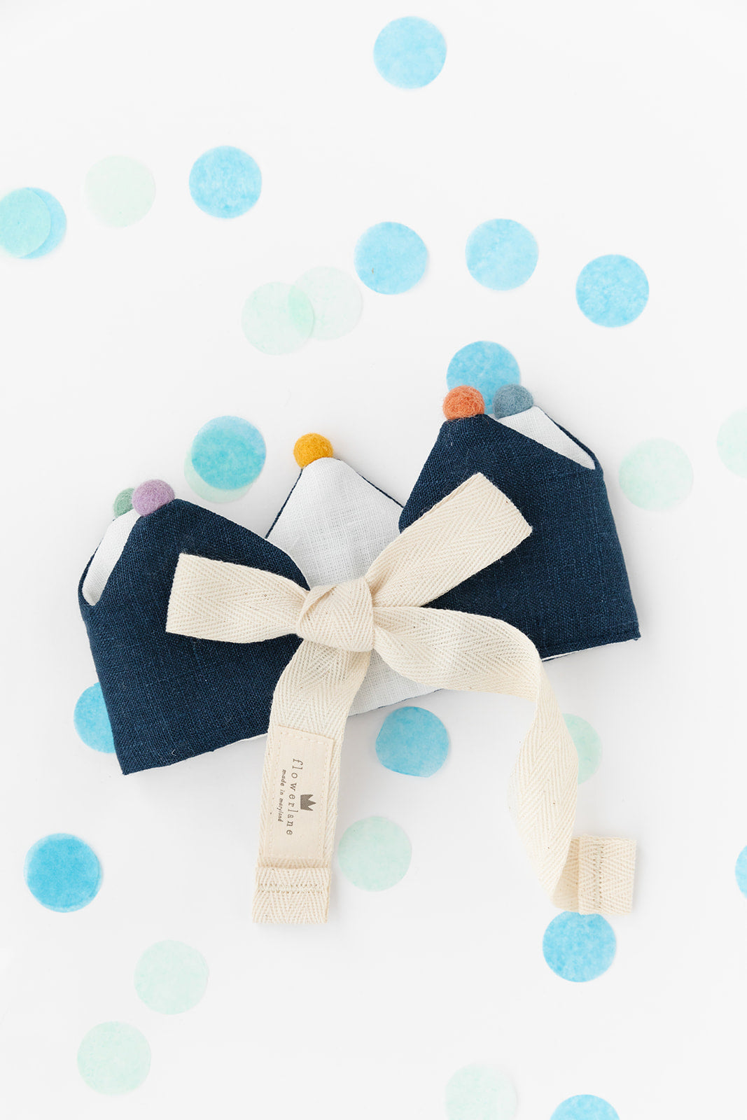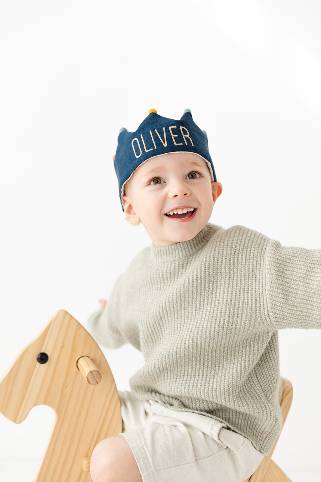 Our personalized crowns are adjustable to fit children of all ages, featuring charming details like colorful wooly pom-poms and soft linen.