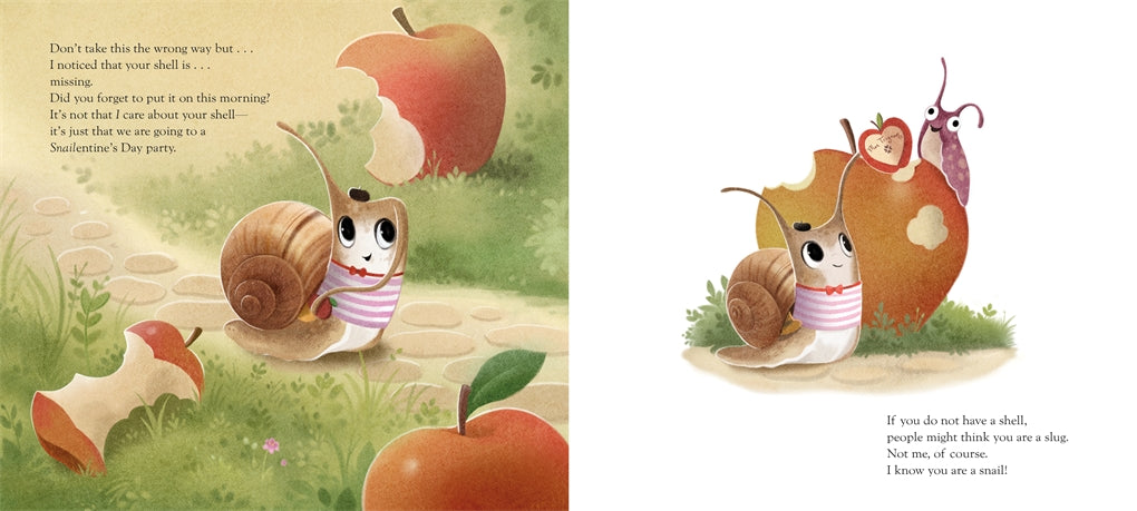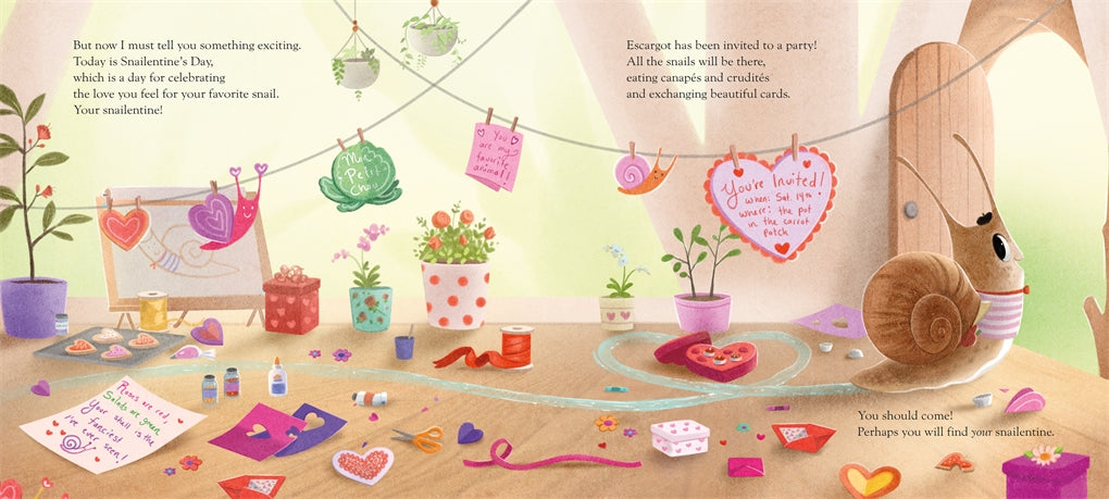 Today is Snailentine's Day, and Escargot is on his way to a party. Will his Snailentine be there? When he arrives, Escargot is a bit nervous and wants to hide in his shell. But in the end, he makes a surprising new friend in a fellow party guest.
