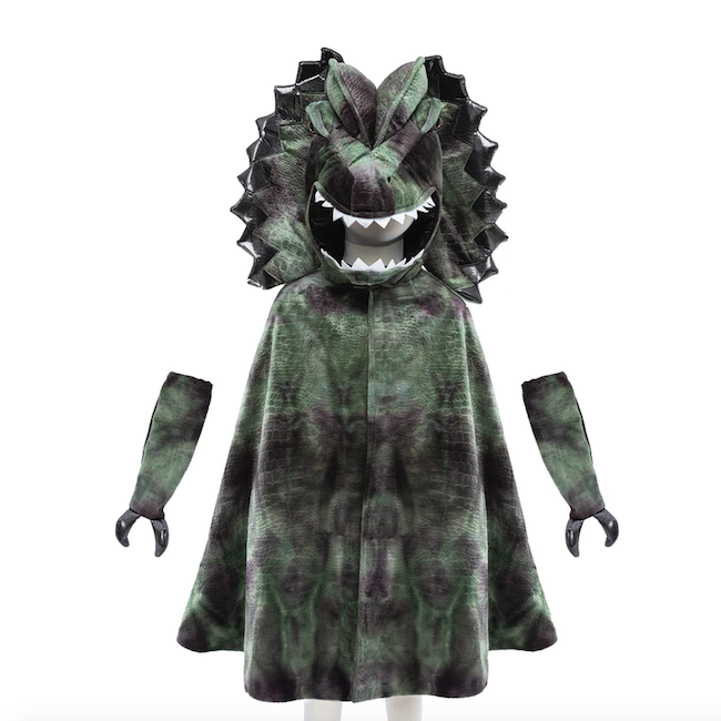Does your Triceratops or T-Rex need a friend? Your child will love this super cute, totally monstrous dinosaur cape! This green, grey, and purple tie-dye cape is lined with black lining. Detailed with grey and purple metallic spikes down the back. The dinosaur head has a removable mouthpiece to ensure a secure fit. This is a two-piece set - cape & claws included.