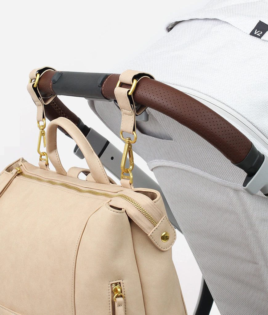 Motherhood means always being on the go! Fawn Design Stroller Hooks make it easy to stroll in style and bring your favorite Fawn Design bag along for the ride. The Velcro and premium matte faux leather straps fit most strollers, and the functional gold hooks allow you to easily attach your favorite Fawn Design bag to your stroller, so all of your necessities are within reach.