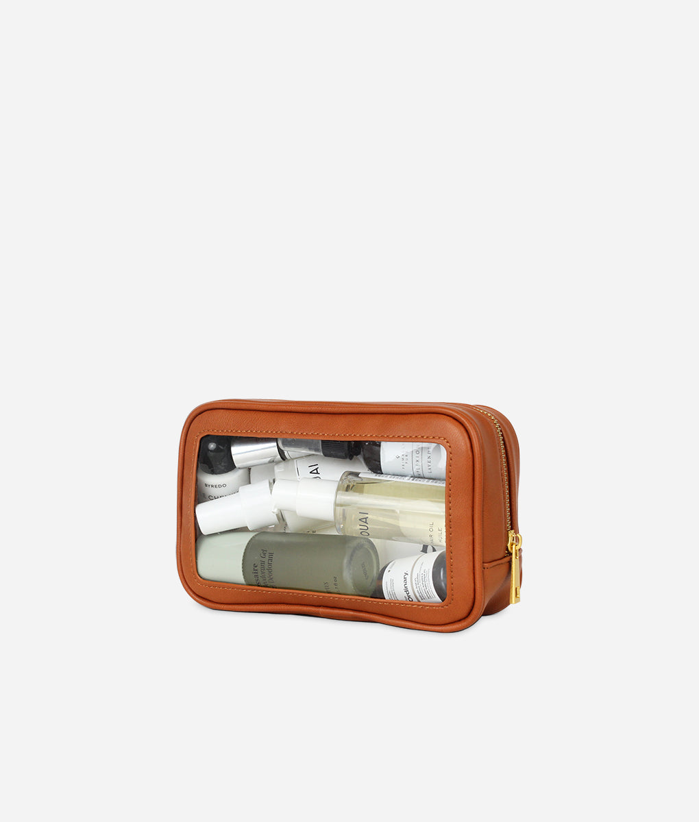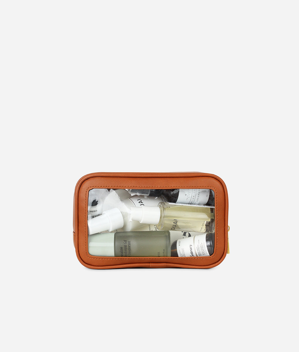 Carry your toiletry essentials with the Fawn Small Toiletry Case. The sleek zippered case is made from premium matte faux leather and clear vinyl.  It can fit most smaller makeup and cosmetic items, plus an eyelash curler, tweezers, Q-tips, cotton pads + more! The clear view on both sides makes it the perfect size for carry-on toiletries!