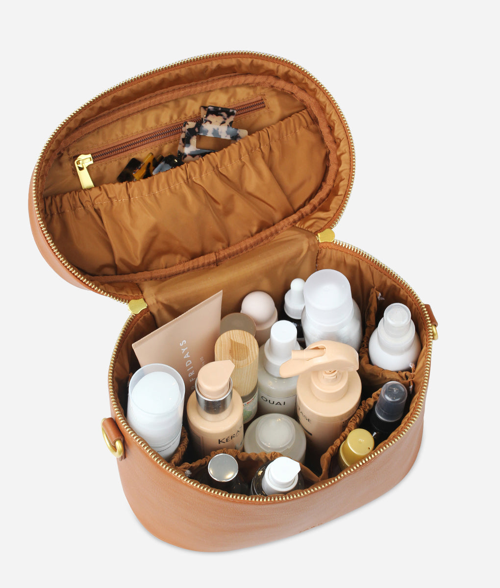 Store your cosmetic and toiletry essentials in style with the Fawn Train Case! This sleek zip-around closure case is made from premium matte faux leather and includes an adjustable messenger strap. The Train Case can fit all your daily must-haves, from skincare, haircare and make-up, to deodorant and a toothbrush. It includes 4 elastic band holders, 5 interior pockets and a zipper pocket to keep jewelry and other smaller items secure. The Train Case makes for perfect toiletry bag for travel and everyday use!