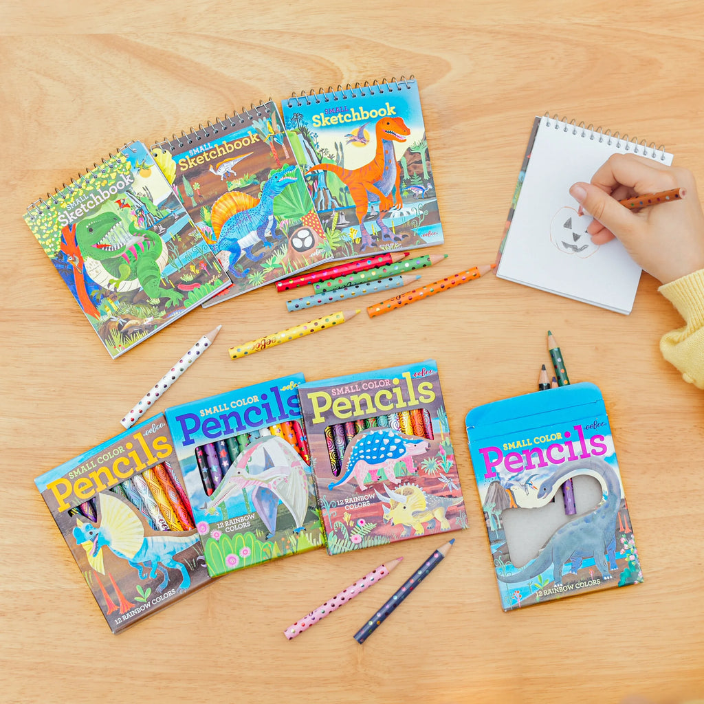 12 small high-quality color pencil sets with beautiful illustrations featuring Ankylosaurus, Dilophosaurus, Diplodocus, Pteranodon, and more. Great for travel.