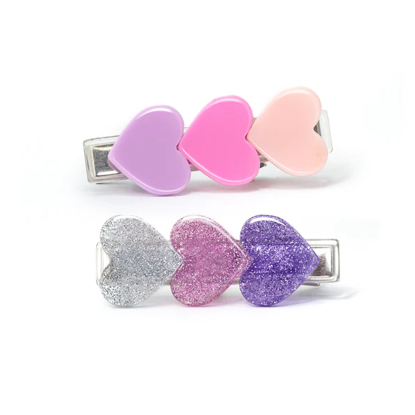 Add a pop of color to your hair with this charming clip set! Featuring sweet hearts in soft pink, vibrant purple, and sparkling glitter, these clips are perfect for any playful hairstyle.