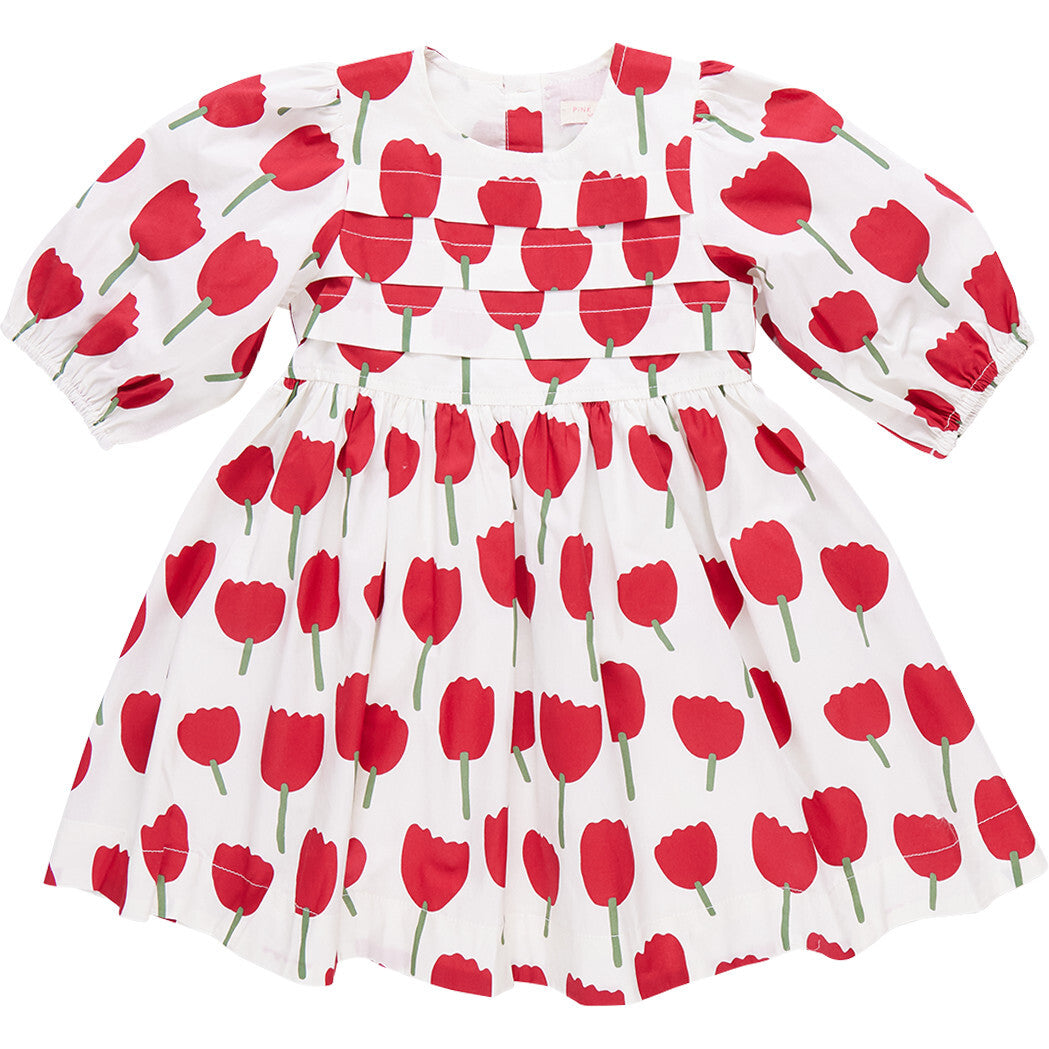 Flower Power! Bright red blooms burst against a crisp white canvas on the Girls Evelyn Dress in the modern floral Red Tulips. A perfectly pleated chest detail, gathered puff sleeve and a three glitter button back closure make this piece extra special. Match with the Girls Brooke Button Up Top or the Baby Girls Evelyn Dress Set for a fresh Big Sis / Little Sis moment. Pleated chest Gathered puff sleeve Elastic sleeve opening Glitter button back closure