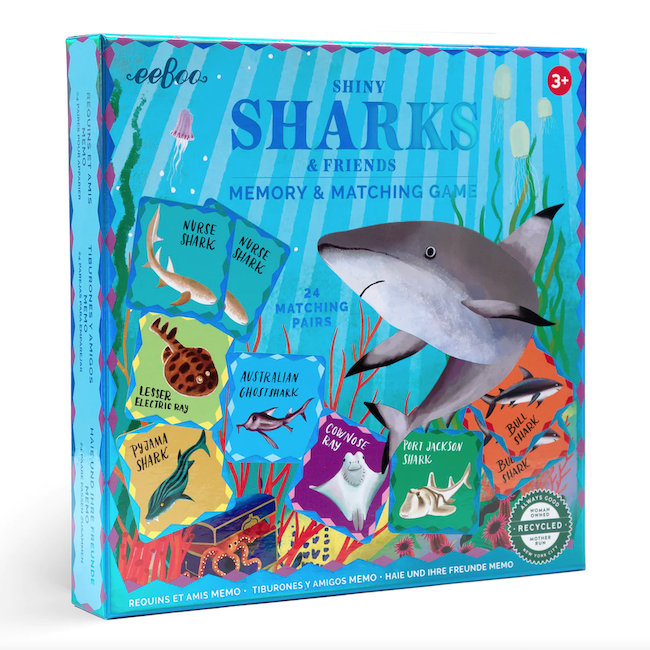 A Memory Matching Game of Sharks and other cartilaginous creatures is a great family game. Beautiful and fun to play. Metallic foil makes this educational activity shine with beautiful, rich and vivid illustrations includes an identification chart.
