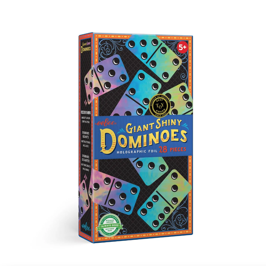 Giant Shiny Dominoes is the classic dominoes game we will remember. Each die-cut domino piece features the classic numbers highlighted with shiny holographic foil. The set includes twenty-eight dominos that are 4.5 x 2.25 inches and made of sturdy and thick cardboard. The classic game of dominoes develops matching skills and is one the whole family can enjoy together. Perfect for a quick game at home or at the park. Winner of Oppenheim Gold Best Toy Award.