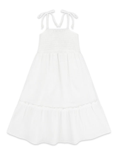 šøĀ Design DetailĀ ā An effortless short dress made with breathable cotton gauze fin solid white with a smocked bodice, square neckline, adjustable straps, and detailed with pearl pony beads at ends.