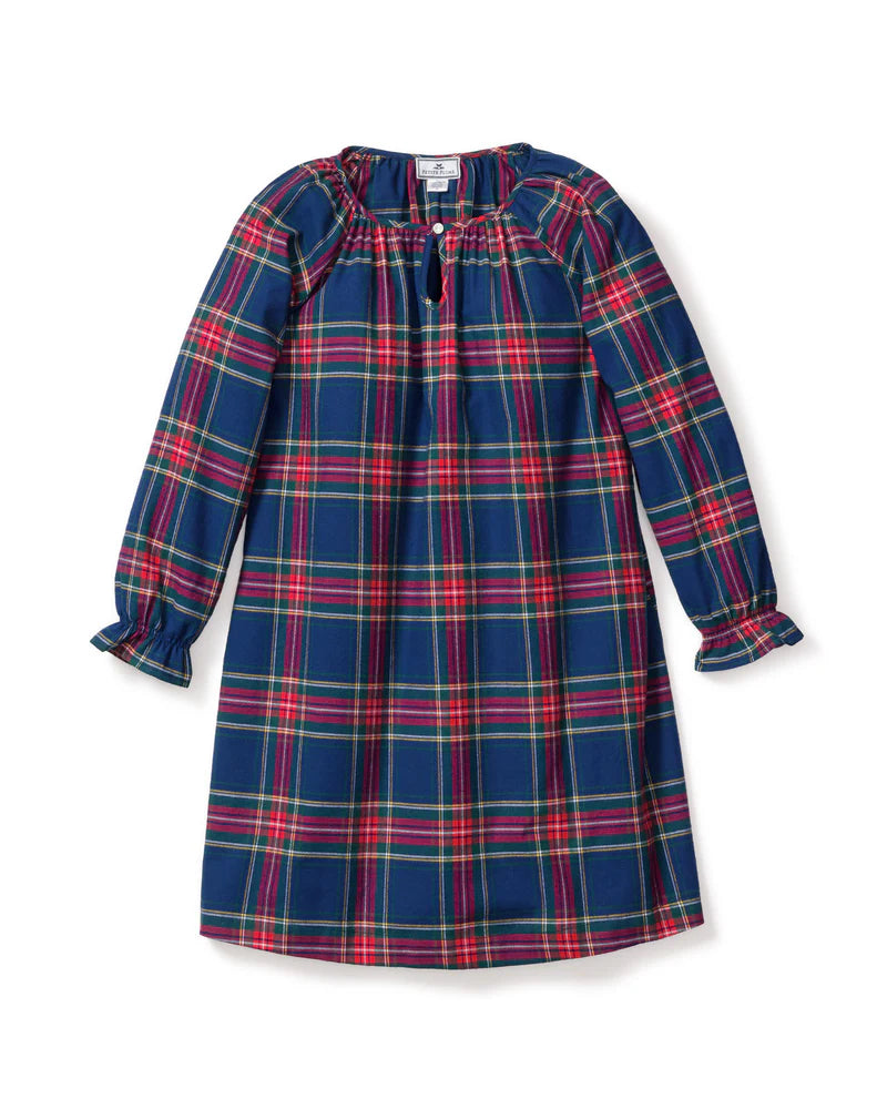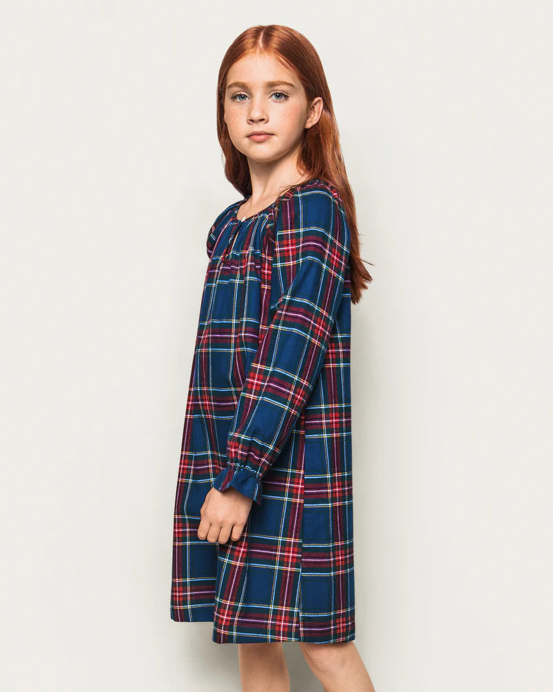A true classic. Primary notes of deep blue with ribbons of rich red and emerald green. Together the Windsor palette suggests crisp, snowy mornings and cozy evenings around a stone fireplace. The Delphine Nightgown whispers of yesteryear with its sweet button detail on the chest and angelic bell sleeves. This nightgown is a lightweight, very soft flannel.