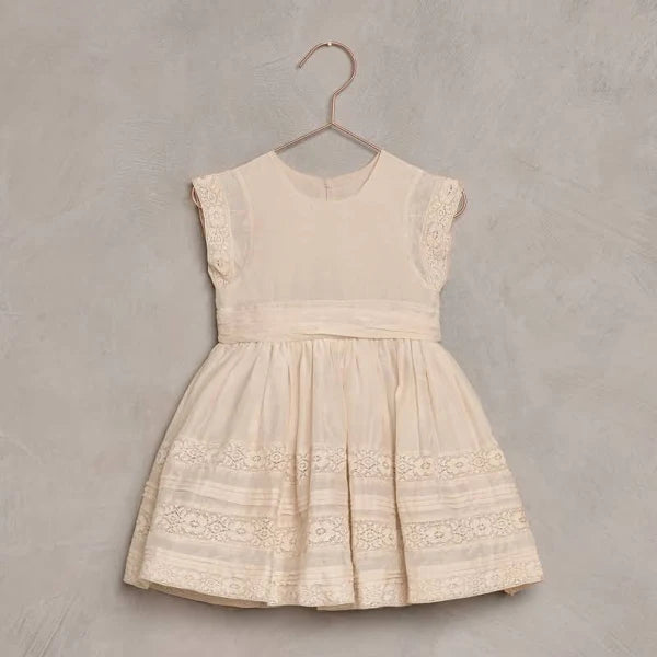This dress has gathered flutter sleeves and lace detailing along the bottom of the dress. With a zipper along the back.