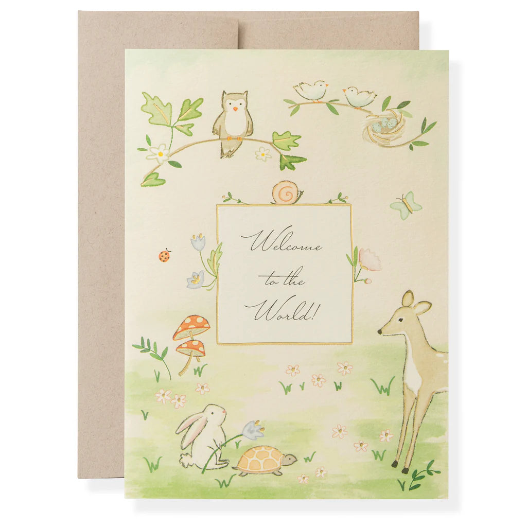 Our Woodland Baby greeting card is printed and foiled in Memphis, TN. Full color ink printed on natural white paper, letterpress printed in gold foil, and paired with a light kraft envelope. Book folded card, blank on the inside.