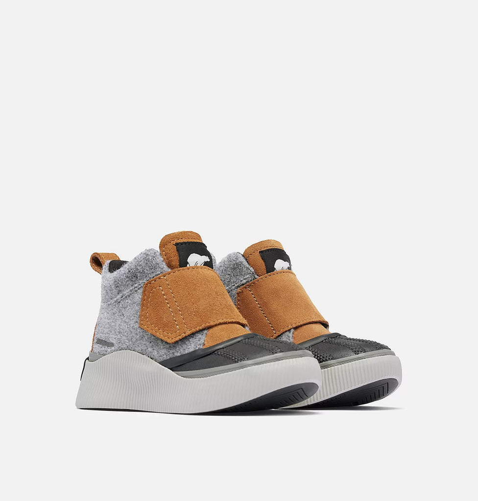 - UPPER: Available in a waterproof suede or waterproof suede and felt combination.Textile lining. Waterproof bootie construction. Waterproof vulcanized rubber shell. Strap closure.