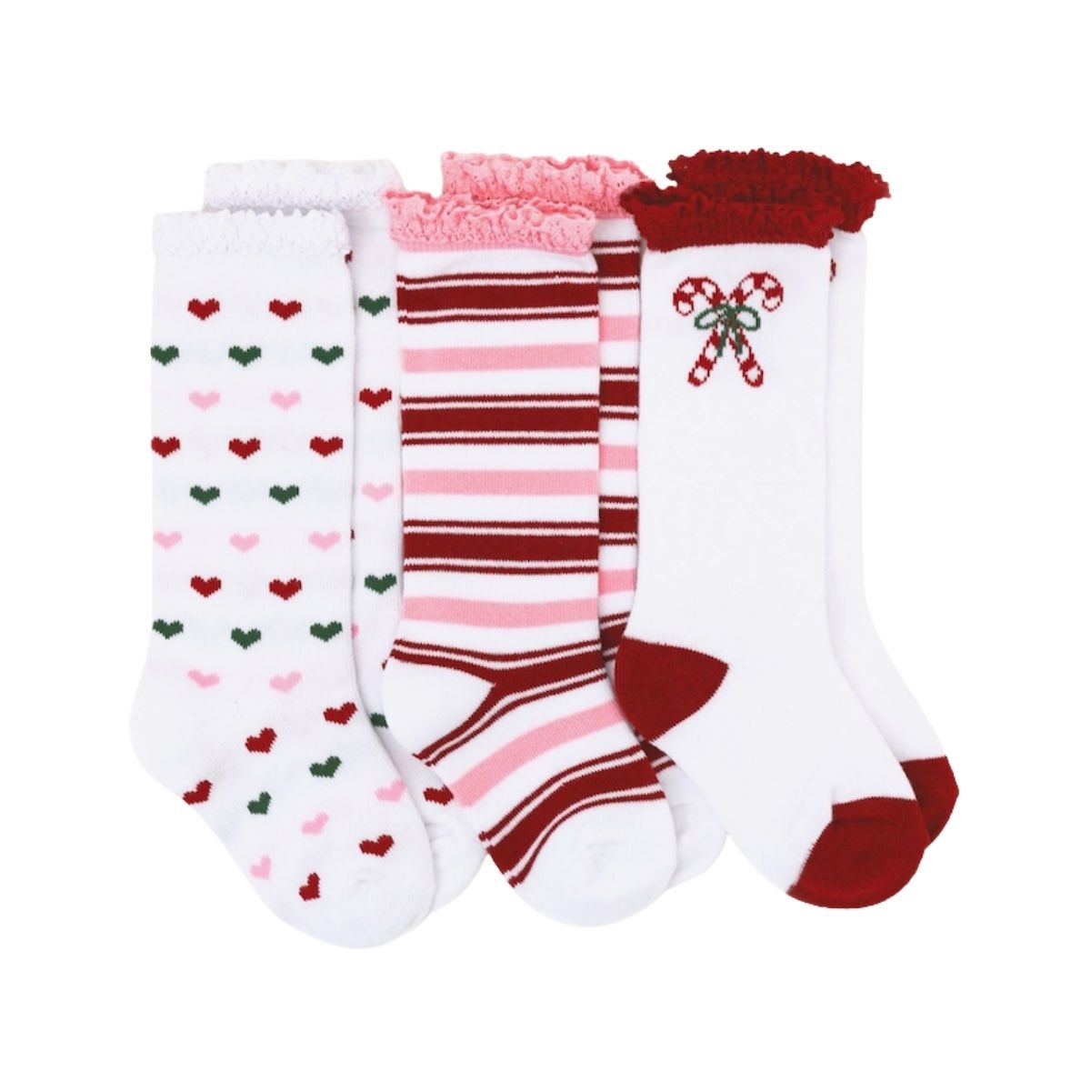 Candy Cane Lane Knee High Sock 3-Pack Candy Canes, stripes, hearts. Could this trio of knee high socks be any sweeter? She'll be skipping down Candy Cane Lane all holiday season long with this pack! It's a must-have. Knee Highs are meant to hit just below the knee. Slight variations in sock length are normal. Machine wash cold with like colors. Tumble dry low or lay flat to dry. 79% cotton / 19% polyester / 2% spandex