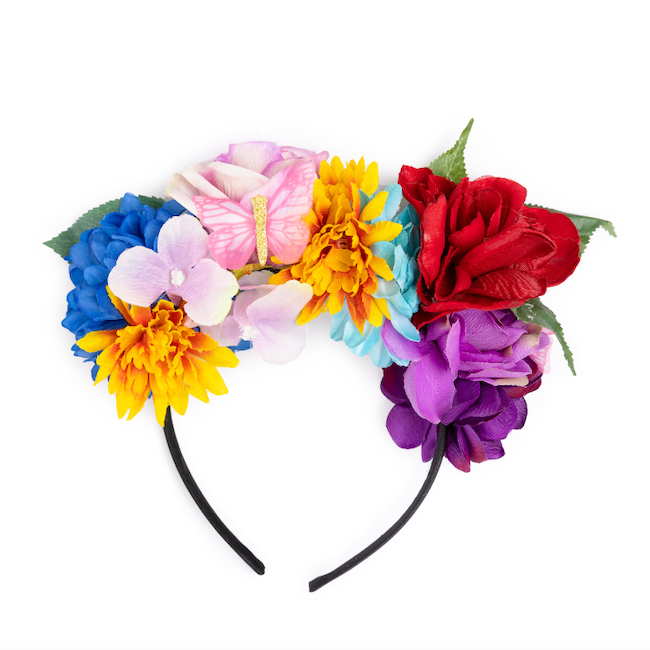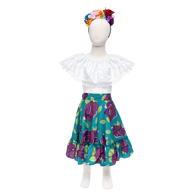 Adorable 3-pc Frida the Artist Set includes a skirt with flower print, a beautiful white blouse, and a flower headband. It is often forgotten that women have been making history since the beginning of time, and this set is dedicated to encourage our young kids to dream big, explore your inner artist, and reach for the stars! The flared skirt features large-print purple flowers, comfortable and size flexible elastic waistband, and a charming ruffle at the bottom. The white blouse is very versatile as your little one can wear it with many different skirts or pants. This top is adorable with a beautiful long ruffle trimmed with an elegant white lace and its very comfortable with elasticized gathering around the neck This set includes a very cute accessory - a vibrant floral headband with black band featuring an assortment of pink, blue, purple, yellow, and red faux flowers with an addition of a whimsical pink butterfly. The skirt and the blouse are machine washable! This set is charming, adorable, and simply irresistible!