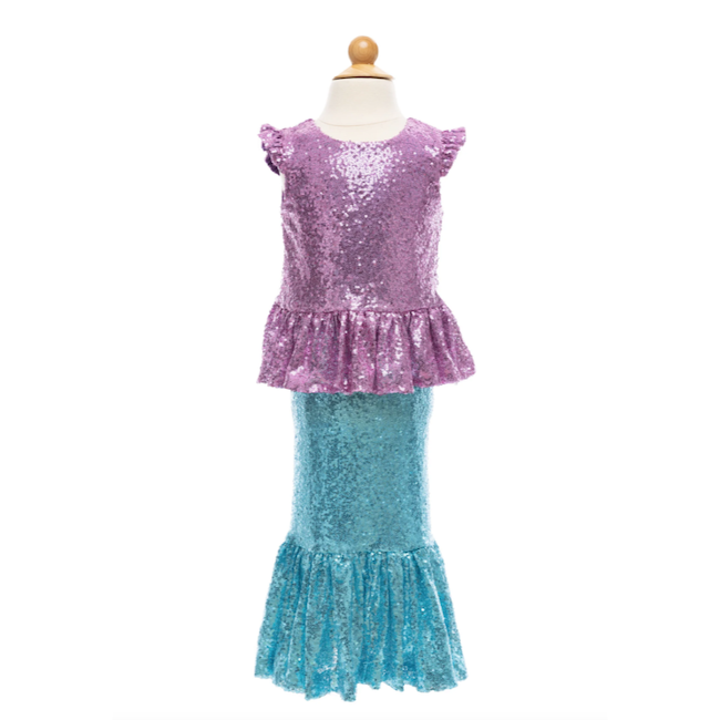 Shimmer through the ocean with our NEW Sequins Sparkle Mermaid Top & Skirt The peplum sequin top is made of thousands of stunning lilac sequins and has a zipper in the back. The mermaid silhouette skirt features beautiful sky-blue sequins with an elastic waistband. This set is sure to make a splash!