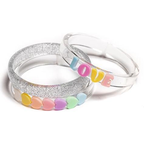 This set comes with a translucent bracelet with acrylic letters, a translucent bangle with acrylic pastel hearts, and a clear glitter bracelet.