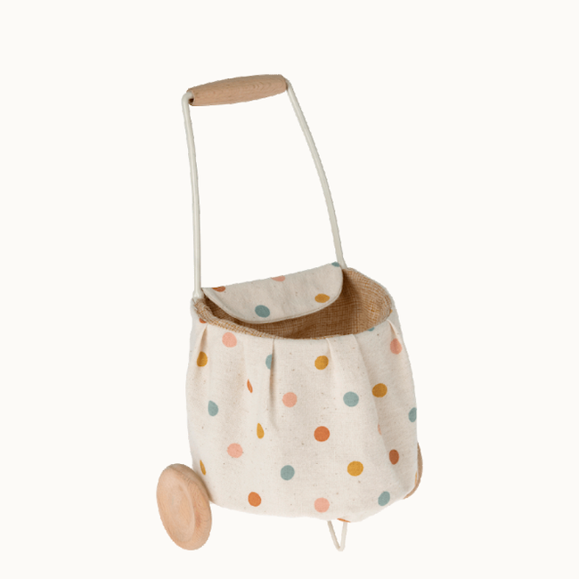 The Maileg trolley multi dots is necessary for carrying all your soft friends and toys around. The trolley is covered with cotton fabric that has a soft coating which will help to keep the fabric clean. The fabric part is easy to take off and wash.