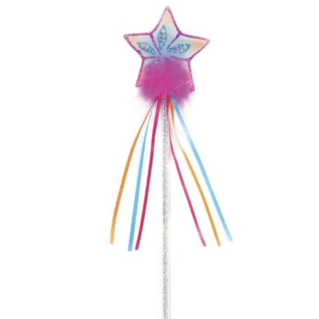 Made to match our Rainbow Glitter Wings, these wands are sure to work magic for little Fairies. Star shaped, with 2 colors of glitter, metallic sparkling stems and several colors of hot cut satin ribbon trailing, these wands are a sure hit.
