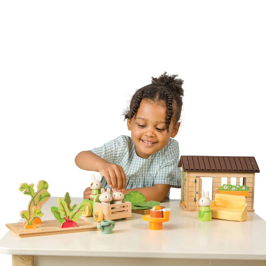 A family of four hungry bunny rabbits has taken residence in an old garden shed! Remove the roof panel and the back wall to create a magical vegetable garden complete with growing carrots, turnips and beetroots. A baby pram has been fashioned out of an old crate for father bunny to ferry the toddlers Twix and Twinkle to and fro, while mummy bunny makes up the cabbage bed and waters the vegetables. When they all get home there is carrot juice and carrot cake for dinner!