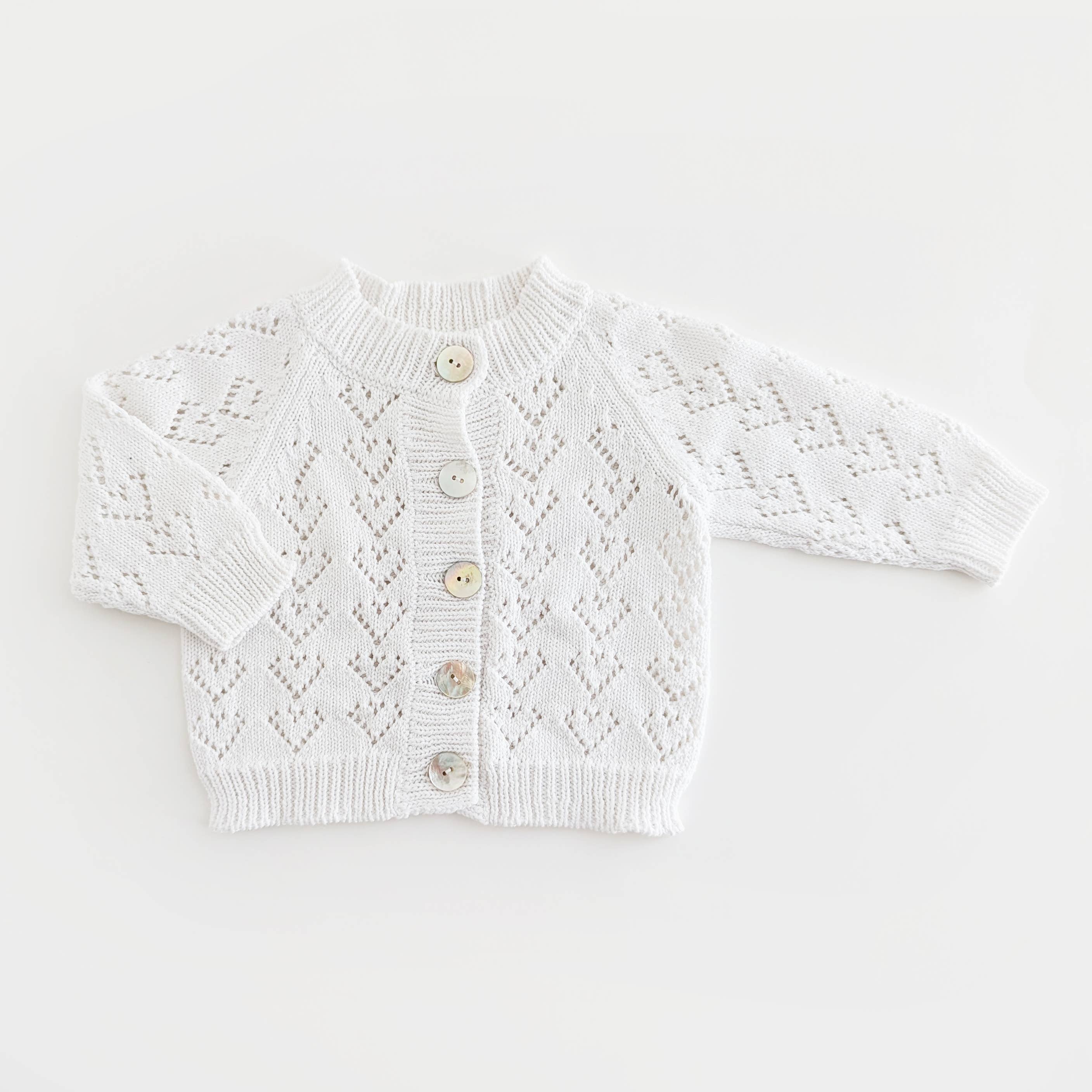 This delightful cardigan sweater features a cute heart lace pattern. It's crafted with cozy white cotton yarn, making it an ideal layering item for any season.