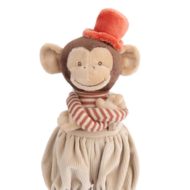 Winston the Monkey is a playful and dapper character. He stands out with his vibrant orange top hat, adding a touch of flair and sophistication to his look. His orange striped shirt brings a lively burst of color, perfectly complementing his tan overalls, which are both stylish and practical for all his monkey adventures. Winston is sure to capture the hearts of both young and old.