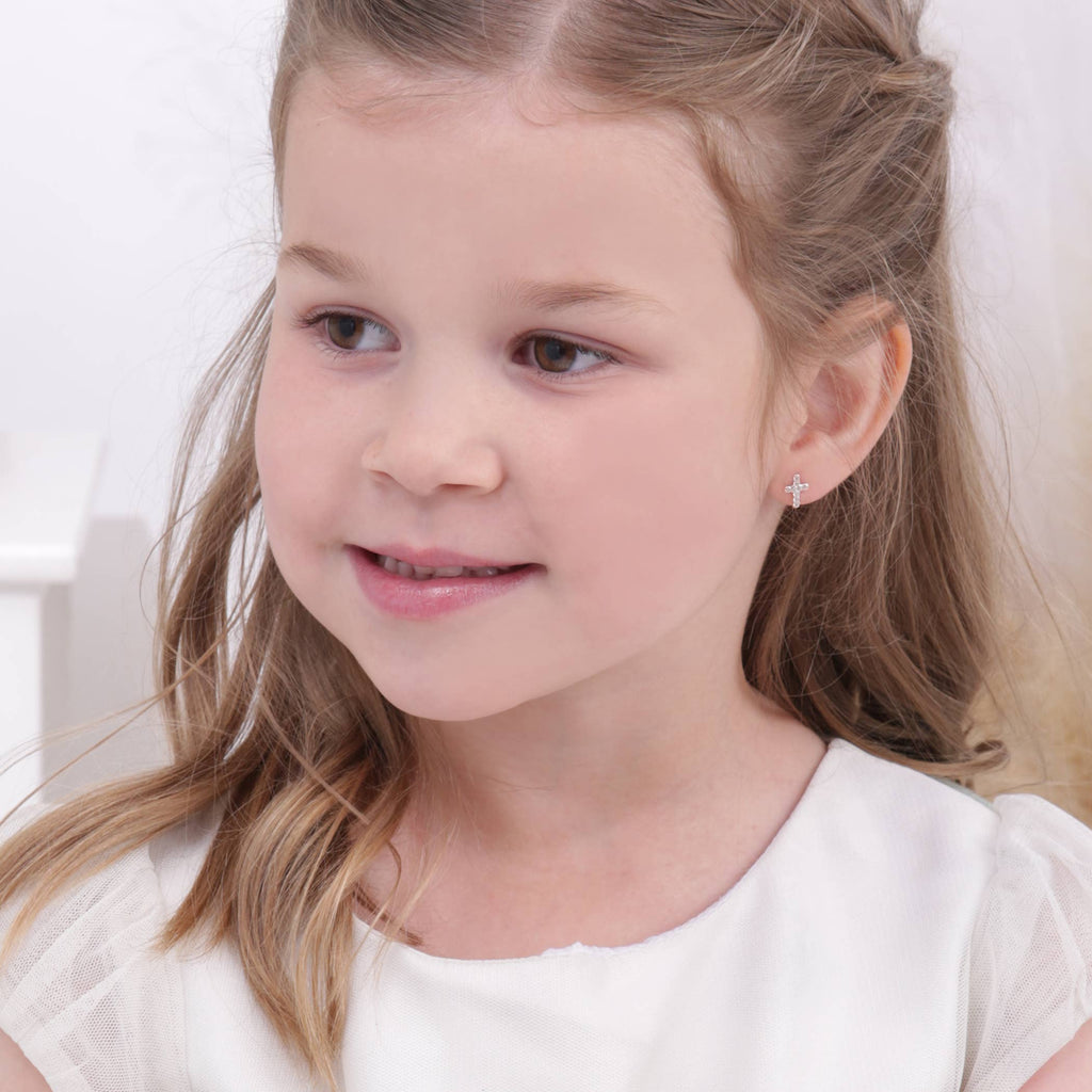 Perfect baptism or first communion gift! Simple and classic sterling silver cross stud earrings with sparkling CZ stones for baptism, christening, or communion gift. These feature a dainty cross accented with tiny sparkling CZ stones ! These earrings have screw backs that are so nice for infants, babies, and toddlers since they stay put so she won't lose them. Earrings include an extra hypo-allergenic, anti-tarnish finish to keep your pieces sparkling beautifully for years and come in darling black velvet heart gift box!