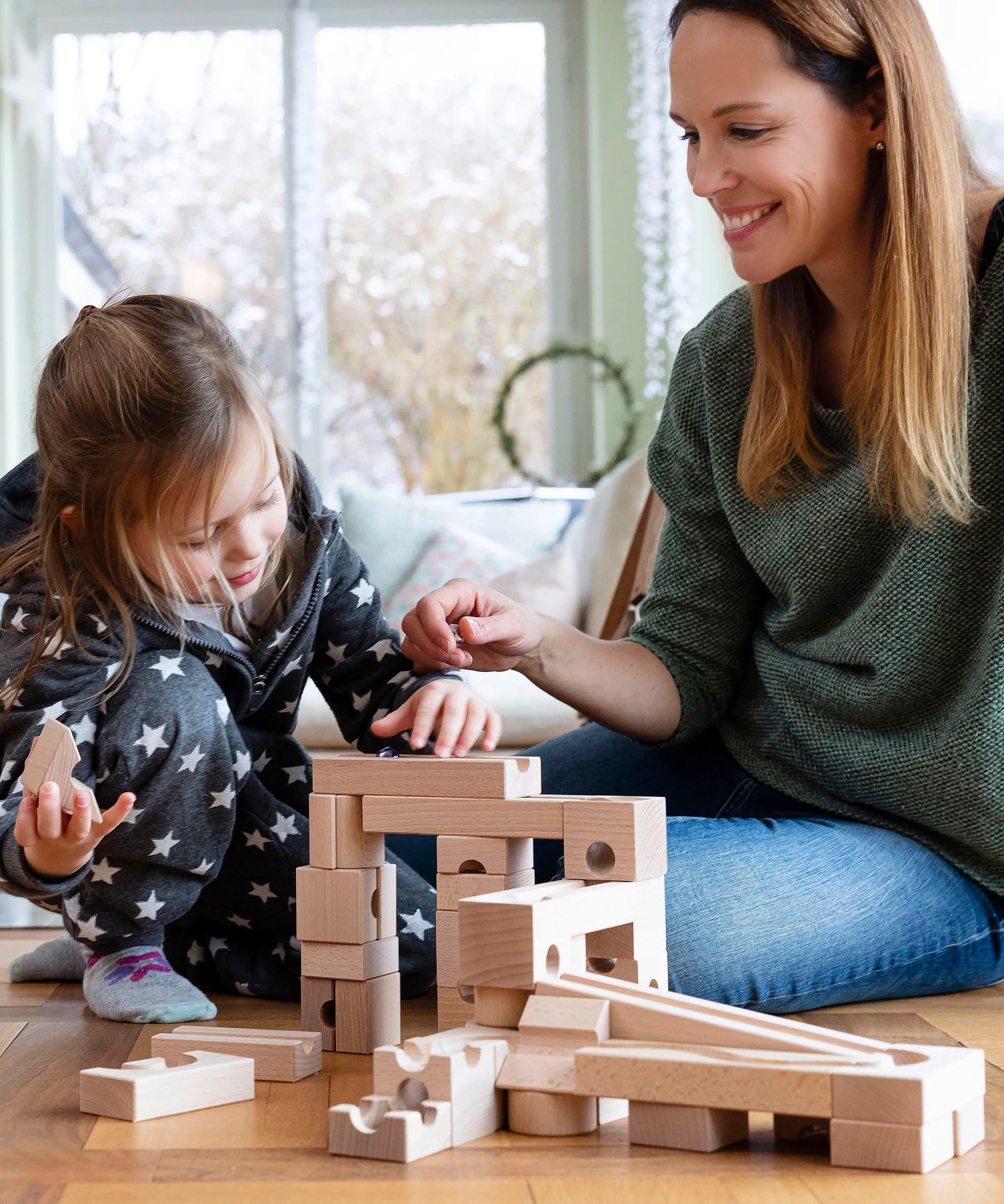 The Cuboro Junior Set is a fab Cuboro starter set with 40 wooden marble run pieces and 6 coloured marbles. There is a broad selection of different marble run construction pieces including rails and cubes, so you and your little one can make a fab selection of different marble run, developing engineering and creativity skills whilst using this fab wooden STEM toy.