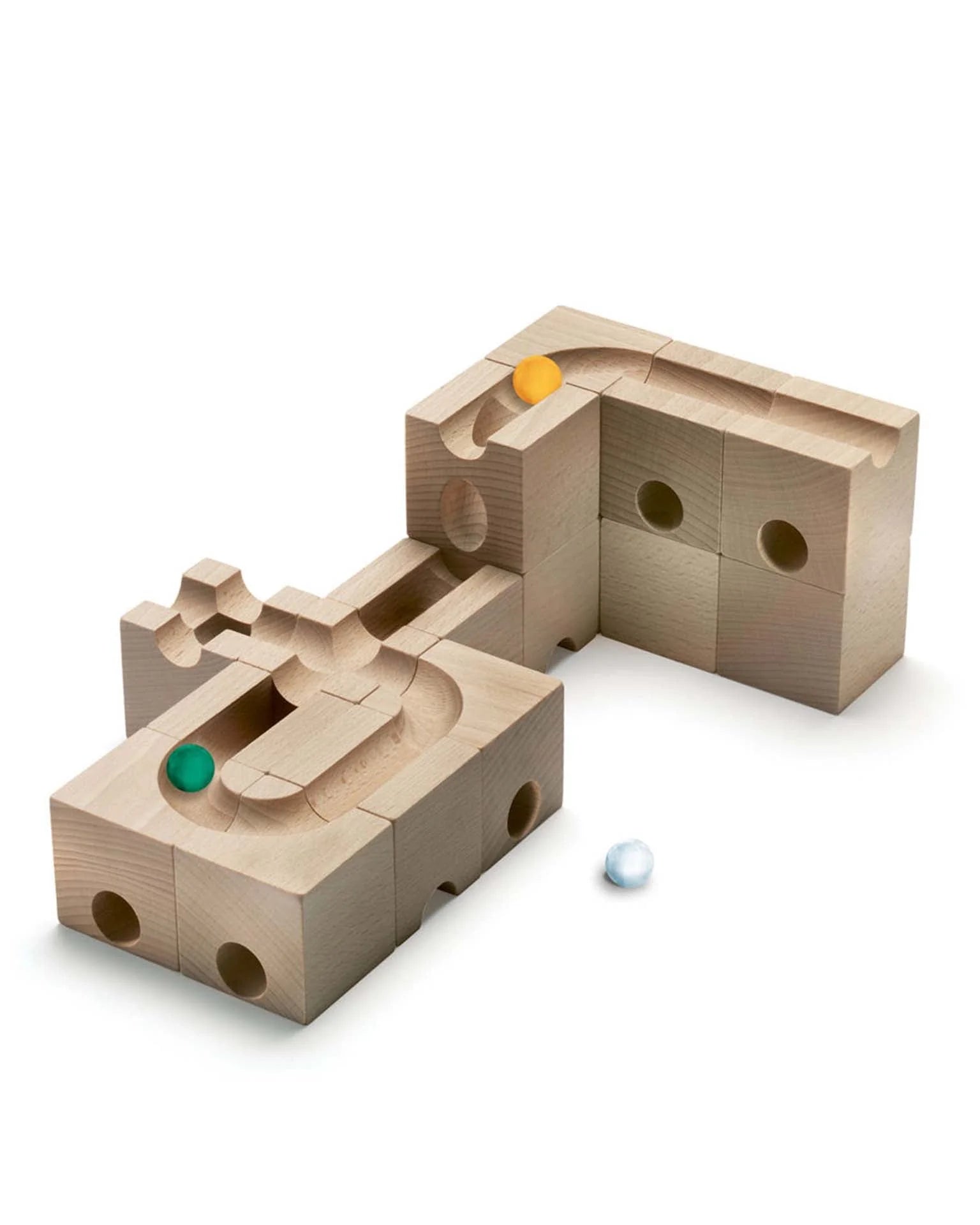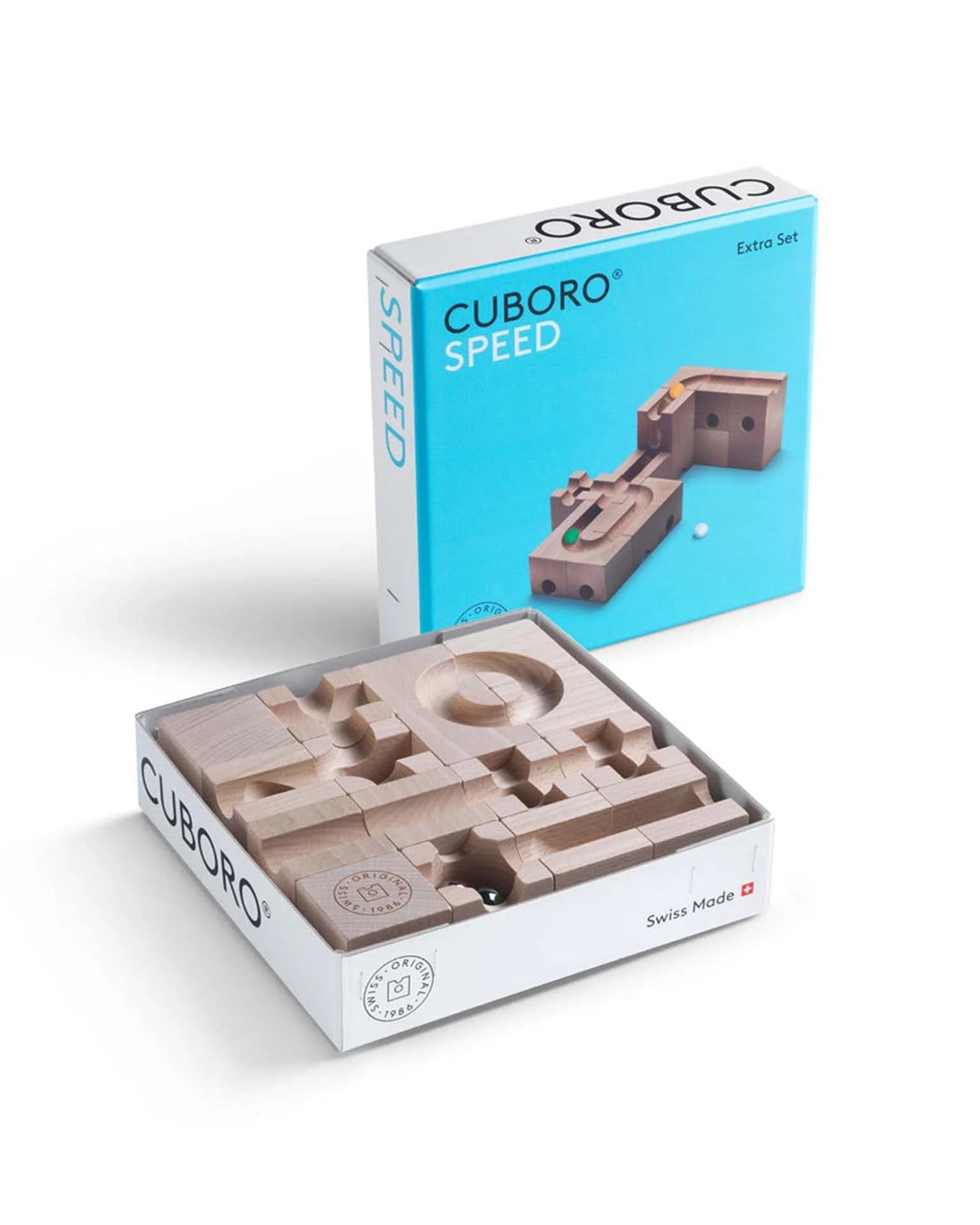 SPEED - the Extra Set for faster runs. The SPEED elements additionally accelerate the marbles to cover longer distances. Extra Sets expand the Starter Sets and offer additional fun. CUBORO challenges children and adults according to their abilities while awakening the joy of experimentation and supporting logical thinking. The marble run system trains fine motor skills, strengthens spatial imagination and stimulates creativity. You can play alone or in a group. CUBORO promotes collaboration - at home, in kindergartens, schools and teams.