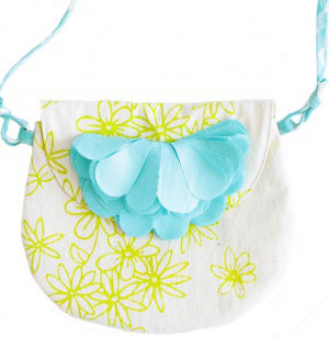 Darling girls green floral cotton canvas purse with an turqouise cotton flower. The straps are in a turquoise and white check cotton. The inside flap has a hidden magnet closure.