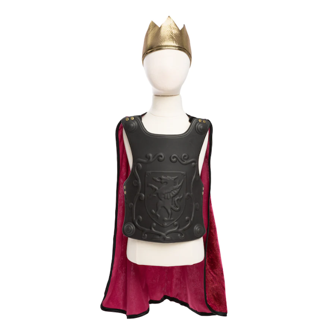 Attached to the chest plate is a regal crushed red velour cape, billowing with the grandeur befitting a heroic knight. As your child dons this ensemble, they'll be ready to defend kingdoms and conquer imaginary dragons with style. To complete the royal look, the set includes a beautiful soft gold crown, adding an extra touch of majesty.