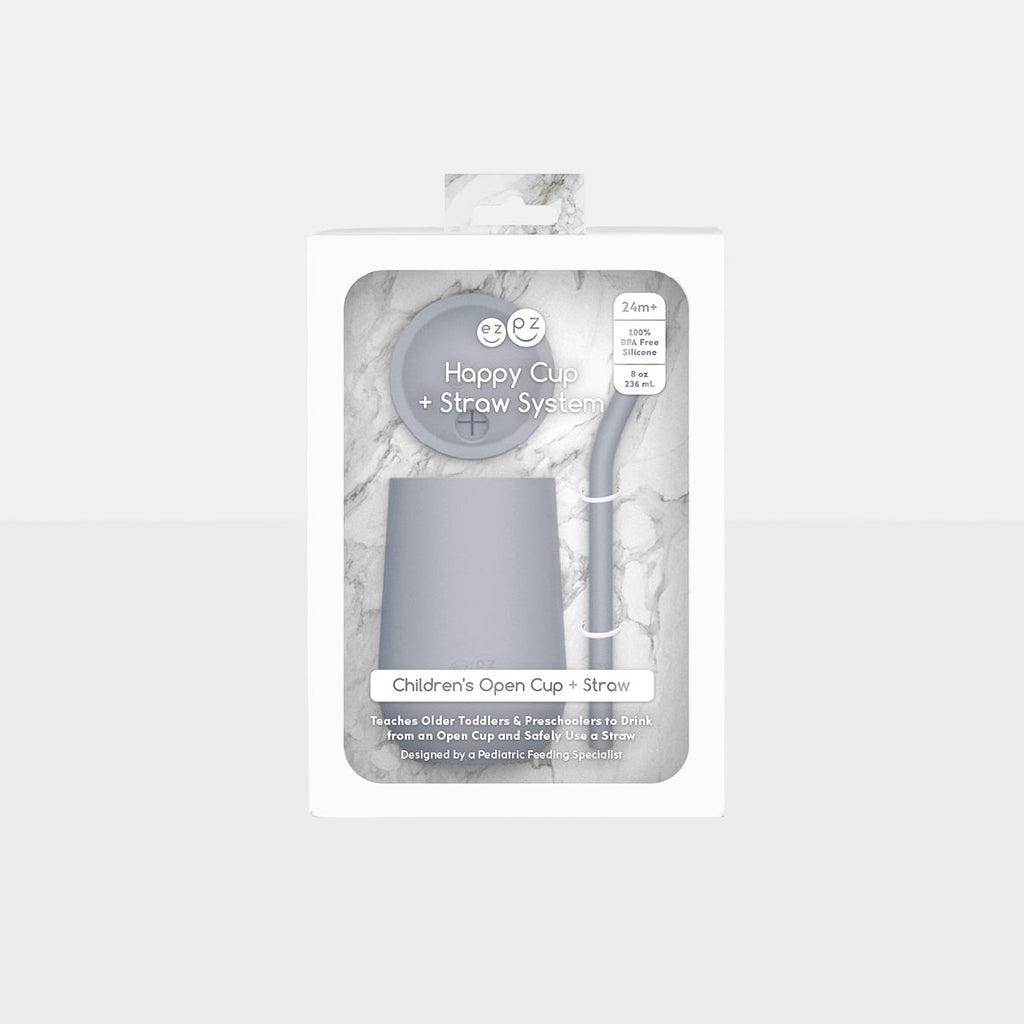 Learning to drink from a straw is an important developmental milestone that develops lip rounding and promotes speech development. The Happy Cup + Straw teaches older toddlers and preschoolers to safely drink from an open cup and straw independently.