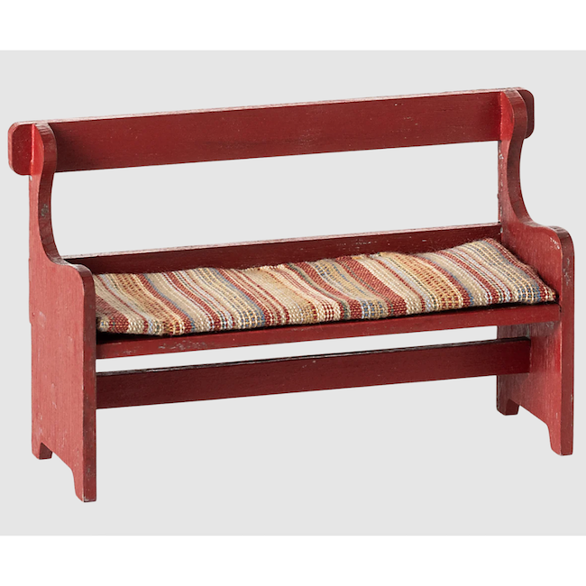 A wooden bench made to fit the mouse family perfectly. It has a beautiful hand painted vintage look - variations may occur - and a soft cushion on top of the bench for a comfortable seat.