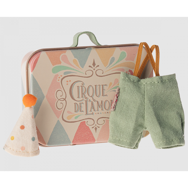 Dress up your little brother mouse in this beautiful set of clown clothes. This set includes pants with suspenders and a hat - all packed in a small metal suitcase so it is easy to bring on the go.