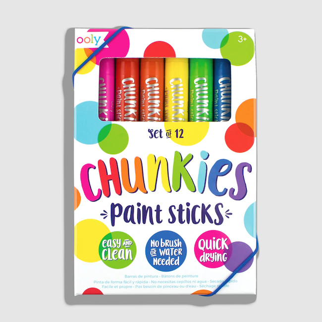 IT’S JUST LIKE PAINT IN A CRAYON When you want to paint colorful pictures but want to leave the mess behind then it’s time to reach for Chunkies Paint Sticks. Chunkies are super easy to use, clean and portable because they’re like painting with a crayon. Just uncap, twist and start painting. Chunkies comes in a set of 12 different colored paint sticks each in a thick barreled casing so they’re easy for little hands to hold. The paint colors are quick drying and won’t smudge, but it’s easy to mix colors to make even more colors. It’s magic! Painting with a Stick No Brush or Water Needed Quick Drying Doesn’t Smudge Thick Barrels are Great for Little Hands Comes in 12 Paint Colors