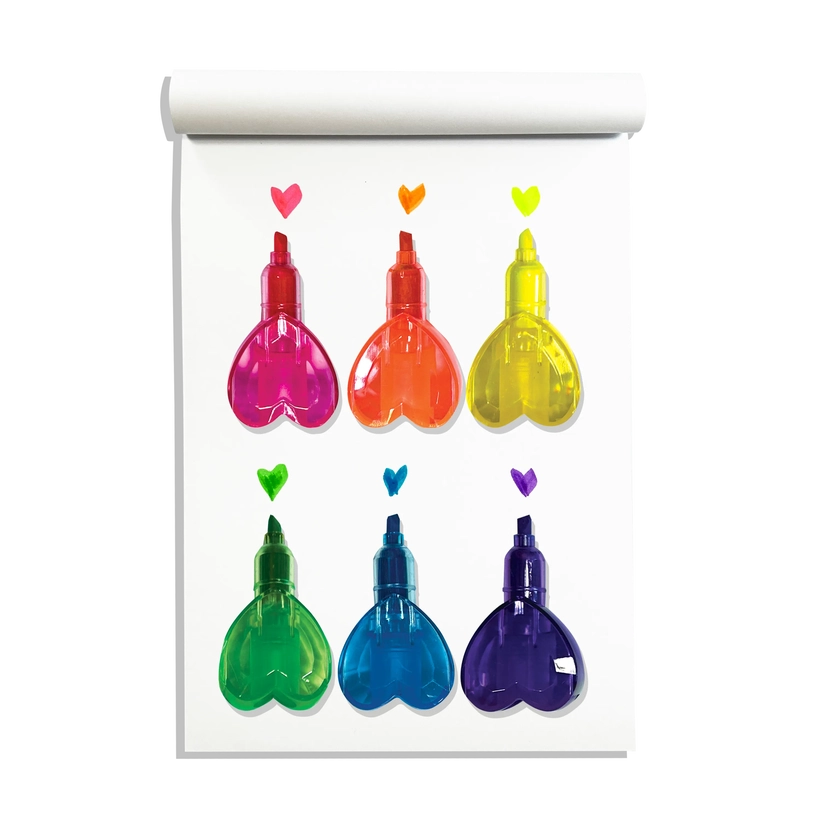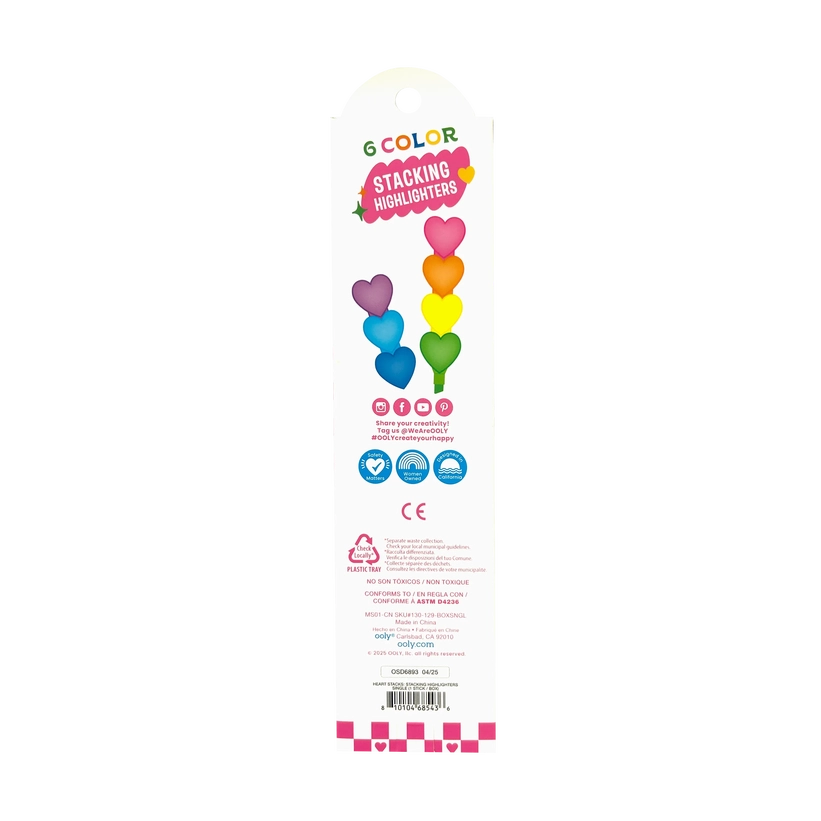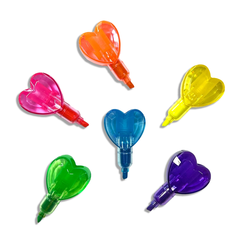 Stackable heart highlighters for easy storage and fun organization 6 Neon colors for bold, eye-catching notes and designs Perfect for kids, students, and creatives who love cute school essentials Smooth-glide ink ensures a seamless writing and highlighting experience Great for school, homework, planners, and DIY projects Compact and portable design makes it easy to take anywhere Suitable for ages 6 and u A set of heart stacking highlighters, display of 16 sets 6 neon colors Chunky barrel Chisel tip Each marker is individually polybagged Cardboard display size 9.44” x 5.3” x 5.3”