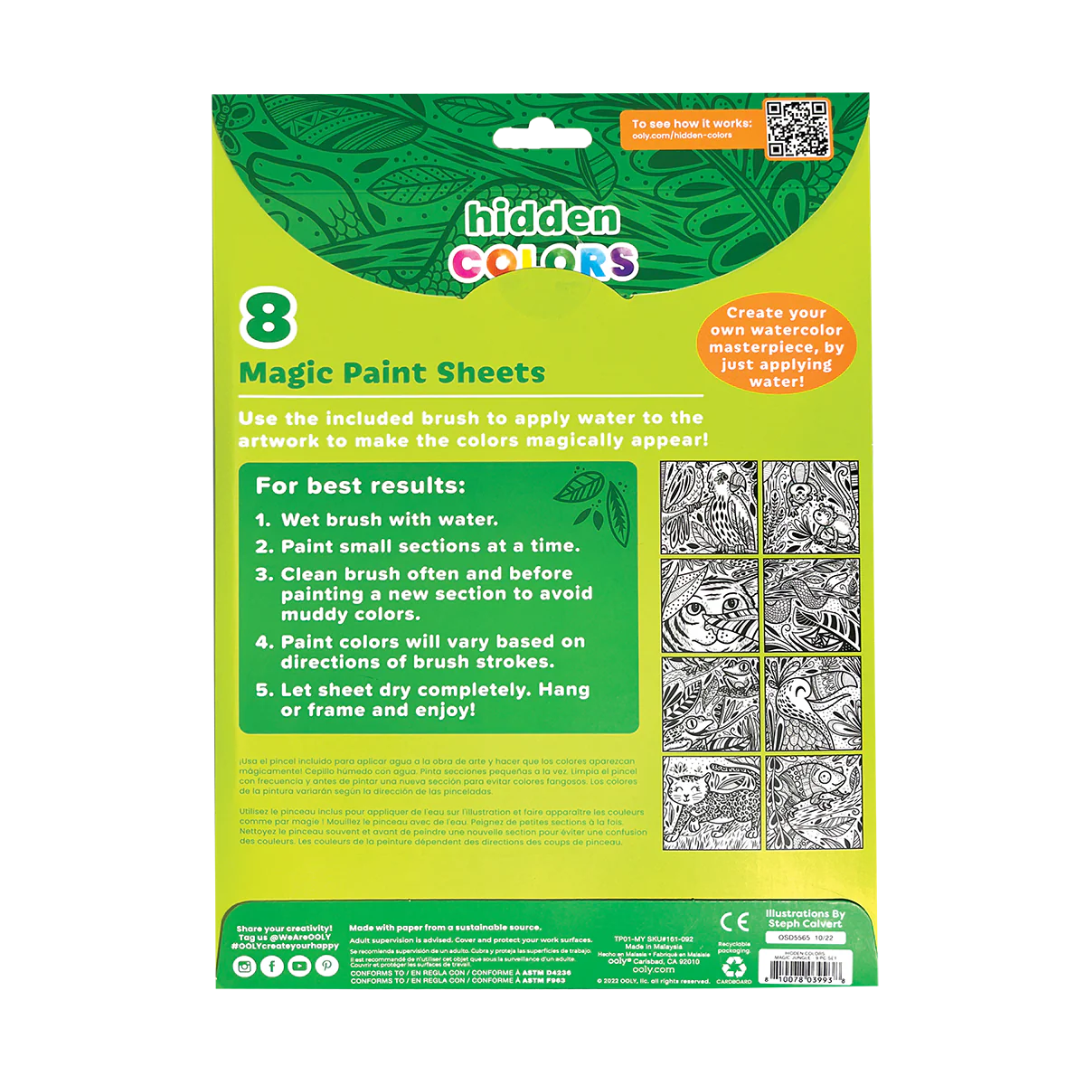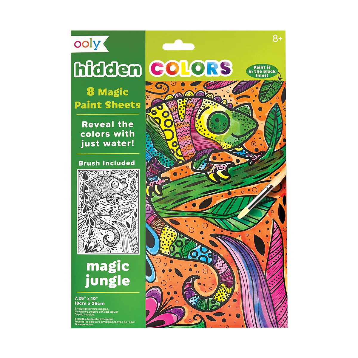 Close your eyes and picture the jungle. What do you see? The bold colors of the birds? The array of greens from the different foliage? The camouflaged colors of the animals lurking among the trees? Bring it all to life with these hidden colors magic painting sheets! Just add water to discover the bright and bold colors of OOLY’s jungle! The kit includes eight different reveal sheets, as well as a brush for applying the water.